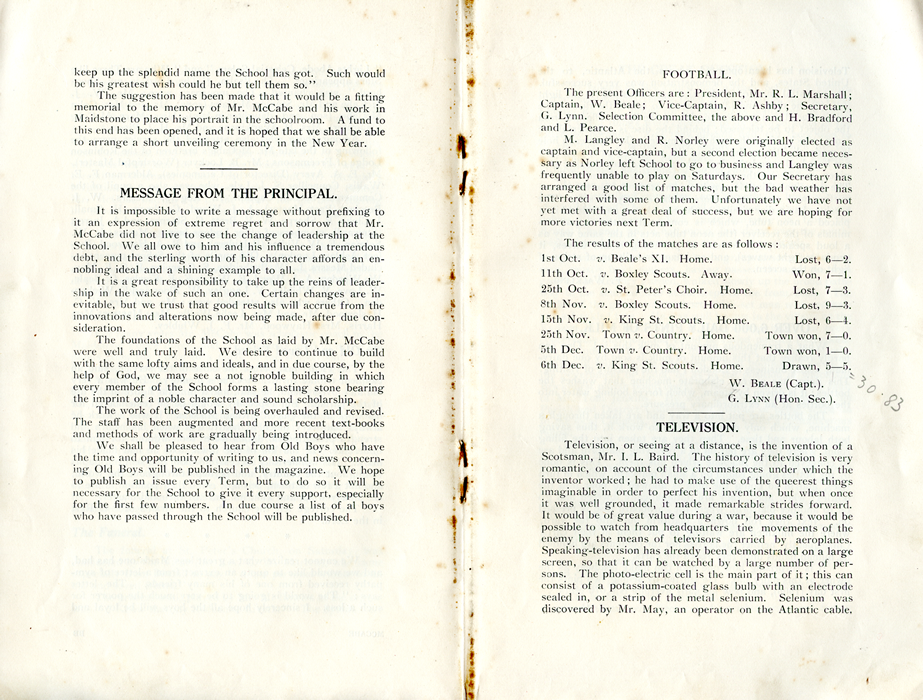 keep up the splendid name the School has got. Such would be his greatest wish could he but tell them so." The suggestion has been made that it would be a fitting memorial to the memory of Mr. McCabe and his work in Maidstone to place his portrait in the schoolroom. A fund to this end has been opened, and it is hoped that we shall be able to arrange a short unveiling ceremony in the New Year. MESSAGE FROM THE PRINCIPAL.It is impossible to write a message without prefixing to it an expression of extreme regret and sorrow that Mr. McCabe did not live to see the change of leadership at the School. We all owe to him and his influence a tremendous debt, and the sterling worth of his character affords an ennobling ideal and a shining- example to all. It is a great responsibility to take up the reins of leadership in the wake of such an one. Certain changes are in-evitable, but we trust that good results will accrue from the innovations and alterations now being made, after due consideration. The foundations of the School as laid by Mr. McCabc were well and truly laid. We desire to continue to build with the same lofty aims and ideals, and in due course, by the help of God, we may see a not ignoble building in which every member of the School forms a lasting stone bearing the imprint of a noble character and sound scholarship. The work of the School is being overhauled and revised. The staff has been augmented and more recent text-books and methods of work are gradually being introduced. We shall be pleased to hear from Old Boys who have the time and opportunity of writing to us. and news concerning Old Boys will be published in the magazine. We hope to publish an issue every Term, but to do so it will be necessary for the School to give it every support, especially for the first few numbers. In due course a list of al boys who have passed through the School will be published. FOOTBALLThe present Officers are: President, Mr. R. L. Marshall; Captain, W. Beale; Vice-Captain, R. Ashby; Secretary, G. Lynn. Selection Committee, the above and H. Bradford and L. Pearce. M. Langley and R. Norley were originally elected as captain and vice-captain, but a second election became necessary as Norley left School to go to business and Langley was frequently unable to play on Saturdays. Our Secretary has arranged a good list of matches, but the bad weather has interfered with some of them. Unfortunately, we have not yet met with a great deal of success, but we are hoping for more victories next Term. TELEVISION.Television, or seeing at a distance, is the invention of a Scotsman, Mr. I. L. Baird. The history of television is very romantic, on account of the circumstances under which the inventor worked; he had to make use of the queerest things imaginable in order to perfect his invention, but when once it was well grounded, it made remarkable strides forward. It would be of great value during- a war, because it would be possible to watch from headquarters the movements of the enemy by the means of televisors carried by aeroplanes. Speaking-television has already been demonstrated on a large screen, so that it can be watched by a large number of persons. The photo-electric cell is the main part of it; this can consist of a potassium-coated glass bulb with an electrode sealed in, or a strip of the metal selenium. Selenium was discovered by Mr. May, an operator on the Atlantic cable. |