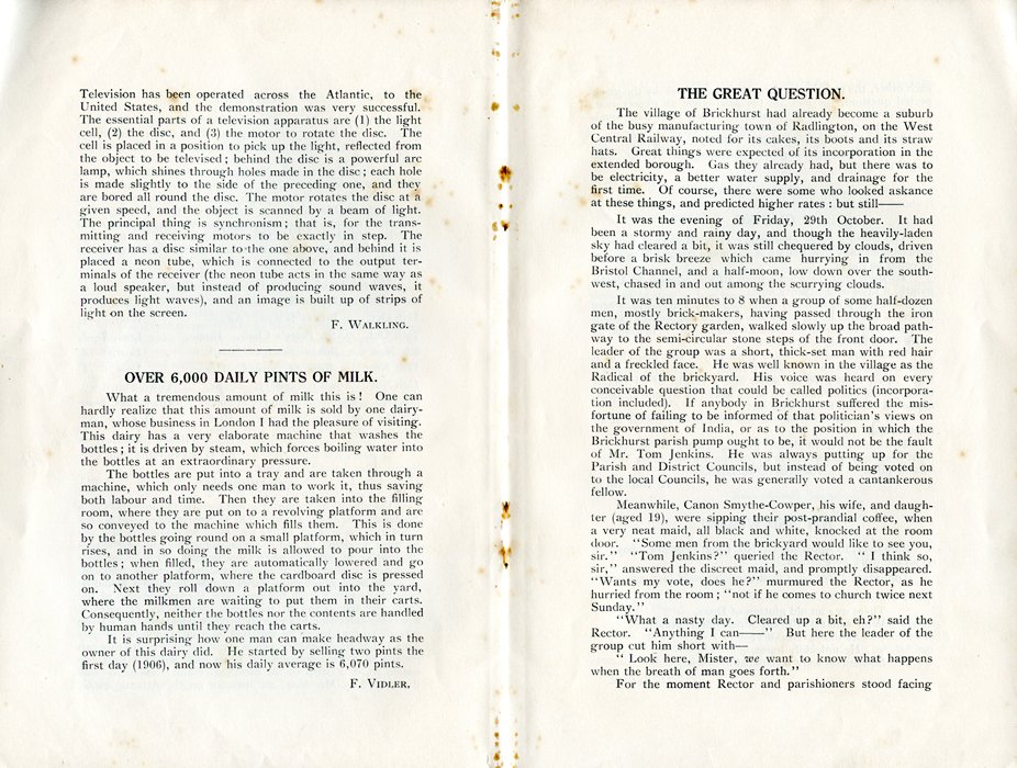 Television has been operated across the Atlantic, to the United States, and the demonstration was very successful. The essential parts of a television apparatus are (1) the light cell, (2) the disc, and (3) the motor to rotate the disc. The cell is placed in a position to pick up the light, reflected from the object to be televised; behind the disc is a powerful arc lamp, which shines through holes made in the disc ; each hole is made slightly to the side of the preceding one, and they are bored all round the disc. The motor rotates the disc at a given speed, and the object is scanned by a beam of light. The principal thing is synchronism; that is, for the transmitting and receiving motors to be exactly in step. The receiver has a disc similar to the one above, and behind it is placed a neon tube, which is connected to the output terminals of the receiver (the neon tube acts in the same way as a loud speaker, but instead of producing sound waves, it produces light waves), and an image is built up of strips of light on the screen. F. WALKLING OVER 6,000 DAILY PINTS OF MILK.What a tremendous amount of milk this is! One can hardly realize that this amount of milk is sold by one dairyman, whose business in London I had the pleasure of visiting. This dairy has a very elaborate machine that washes the bottles; it is driven by steam, which forces boiling water into the bottles at an extraordinary pressure. The bottles are put into a tray and are taken through a machine, which only needs one man to work it, thus saving both labour and time. Then they are taken into the filling room, where they are put on to a revolving platform and are so conveyed to the machine which fills them. This is done by the bottles going round on a small platform, which in turn rises, and in so doing the milk is allowed to pour into the bottles; when filled, they are automatically lowered and go on to another platform, where the cardboard disc is pressed on. Next they roll down a platform out into the yard, where the milkmen are waiting to put them in their carts. Consequently, neither the bottles nor the contents arc handled by human hands until they reach the carts. It is surprising how one man can make headway as the owner of this dairy did. He started by selling two pints the first day (190C), and now his daily average is 6,070 pints. F. VIDLER THE GREAT QUESTION.The village of Brickhurst had already become a suburb of the busy manufacturing town of Radlington, on the West entral Railway, noted for its cakes, its boots and its straw hats. Great things were expected of its incorporation in the extended borough. Gas they already had, but there was to be electricity, a better water supply, and drainage for the first time. Of course, there were some who looked askance at these things, and predicted higher rates : but still--- It was the evening of Friday, 29th October. It had been a stormy and rainy day, and though the heavily-laden sky had cleared a bit, it was still chequered by clouds, driven before a brisk breeze which came hurrying in from the Bristol Channel, and a half-moon, low down over the southwest, chased in and out among the scurrying clouds. It was ten minutes to 8 when a group of some half-dozen men, mostly brick-makers, having passed through the iron gate of the Rectory garden, walked slowly up the broad pathway to the semi-circular stone steps of the front door. The leader of the group was a short, thick-set man with red hair and a freckled face. He was well known in the village as the Radical of the brickyard. His voice was heard on every conceivable question that could be called politics (incorporation included). If anybody in Brickhurst suffered the misfortune of failing to be informed of that politician's views on the government of India, or as to the position in which the Brickhurst parish pump ought to be, it would not be the fault of Mr. Tom Jenkins. He was always putting up for the Parish and District Councils, but instead of being voted on to the local Councils, he was generally voted a cantankerous fellow. Meanwhile, Canon Smythe-Cowper, his wife, and daughter (aged 19), were sipping their post-prandial coffee, when a very neat maid, all black and white, knocked at the room door. "Some men from the brickyard would like to see you, sir." "Tom Jenkins?" queried the Rector. " I think so, sir," answered the discreet maid, and promptly disappeared. "Wants my vote, does he?" murmured the Rector, as he hurried from the room; "not if he comes to church twice next Sunday.'' "What a nasty day. Cleared up a bit, eh?" said the Rector. "Anything I can" But here the leader of the group cut him short with— " Look here, Mister, we want to know what happens when the breath of man goes forth." For the moment Rector and parishioners stood facing |