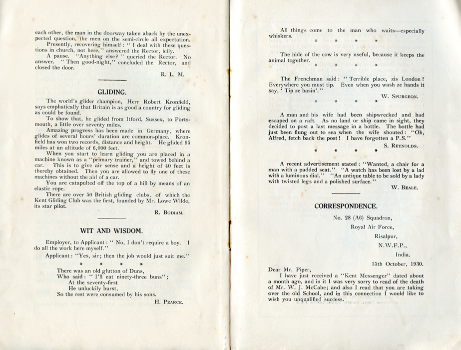 each other, the man in the doorway taken aback by the unexpected question, the men on the semi-circle all expectation. Presently, recovering himself: " I deal with these questions in church, not here," answered the Rector, icily. A pause. "Anything else? " queried the Rector. No answer. " Then good-night," concluded the Rector, and closed the door. R. L. M. GLIDING.The world's glider champion, Herr Robert Kronfield, says emphatically that Britain is as good a country for gliding as could be found. To show that, he glided from Itford, Sussex, to Portsmouth, a little over seventy miles. Amazing progress has been made in Germany, where glides of several hours' duration are common-place. Kronfield has won two records, distance and height. He glided 95 miles at an altitude of 6,000 feet. When you start to learn gliding you are placed in a machine known as a "primary trainer," and towed behind a car. This is to give air sense and a height of 40 feet is thereby obtained. Then you are allowed to fly one of these machines without the aid of a car. You are catapulted off the top of a hill by means of an elastic rope. There are over 50 British gliding clubs, of which the Kent Gliliding Club was the first, founded by Mr. Lowe Wilde, its star pilot. R. BODIAM. WIT AND WISDOM.Employer, to Applicant: " No, I don't require a boy. I do all the work here myself." There was an old glutton of Duns, H. PEARCE. All things come to the man who waits—especially whiskers. The hide of the cow is very useful, because it keeps the animal together. The Frenchman said: " Terrible place, zis London ! Everywhere you must tip. Even when you wash ze hands it say, ' Tip ze basin'." W. SPURGEON. A man and his wife had been shipwrecked and had escaped on a raft. As no land or ship came in sight, they decided to post a last message in a bottle. The bottle had just been flung out to sea when the wife shouted: "Oh, Alfred, fetch back the post ! I have forgotten a P.S." S. REYNOLDS. A recent advertisement stated : "Wanted, a chair for a man with a padded seat." "A watch has been lost by a lad with a luminous dial. " "An antique table to be sold by a lady with twisted legs and a polished surface." W. BEALE. CORRESPONDENCE.No. 28 (A6) Squadron, Royal Air Force, Risalpur, N.W.F.P., India. 15th October, 1930. Dear Mr. Piper, I have just received a "Kent Messenger" dated about a month ago, and in it I was very sorry to read of the death of Mr. W. J. McCabe; and also I read that you are taking over the old School, and in this connection I would like to wish you unqualified success. |