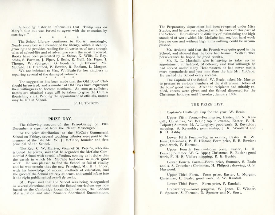 A budding historian informs us that "Philip was on Mary's side but was forced to agree with the execution by marriage." The School Library continues to flourish amazingly. Nearly every boy is a member of the library, which is steadily growing and provides reading for all varieties of taste though tales of school-life and of adventure seem the most favoured. Books have been presented by G. Stone, K. Wills, L. Reynolds, S. Farman, J. Piper, J. Beale, R. Yuill, Mr. Piper, I. Thorpe, W. Spurgeon, G. Goodchild, J. Elbourn, Mr. McCabe, H. Bradford, P. Bowler, R. Bodiam, L. Morgan. The suggestion has been made that the Old Boys' Club should be revived, and a number of Old Boys have expressed their willingness to become members. As soon as sufficient names are obtained steps will be taken- to give the Club a flourishing start. Pending the appointment of officials, names may be left at School. F. H. TOLPUTT. PRIZE DAY.The following account of the Prize-Giving on 19th December is reprinted from the "Kent Messenger." At the prize distribution at the McCabe Commercial School on Friday, several touching tributes were paid to the memory of the late Mr. W. J. McCabe, founder and first principal of the School. The Rev. C. W. Martyn, Vicar of St. Peter's, who distributed the prizes, said that he regarded the McCabe Commercial School with special affection, coming as it did within the parish in which Mr. McCabe had done so much good work. He was pleased to find the School so full of vitality and he was certain that the new Principal, Mr. H. I. Piper, with his knowledge of modern methods of education, had the good of the School entirely at heart, and would infuse into it the right public school esprit de corps. Mr. Piper said that the School was being re-organized in several directions and that the School curriculum was now based on the Cambridge Local Examinations, the London Matriculation and also Pitman's Shorthand Examinations. The Preparatory department had been re-opened under Miss Stubbs, and he was very pleased with the work of this part of the School. He realized the difficulty of maintaining the high standard of work which Mr. McCabe had set, but hard work hurt no one and without high aims nothing could be accomplished. Mr. Ardontz said that the French was quite good in the School, and showed that the boys had brains. With further perseverance he hoped for good results. Mr. R. L. Marshall, who is leaving to take up an appointment at Ashford, Middlesex, said that although he had served under many Headmasters he had never met a more sympathetic and just man than the late Mr. McCabe. He wished the School every success. The Captain of the School, W. Beale, asked Mr. Martyn to present to various members of the staff a small token of the boys' good wishes. After the recipients had suitably replied, cheers were given and the School dispersed for the Christmas holidays until Tuesday, January 13th. THE PRIZE LIST.Captain's Challenge Cup for the year, W. Beale. Upper Fifth Form Form prize, Easter, F. N. Randall; Christmas, W. Beale; top in exams., Easter, F. H. Tolputt ; Summer, M. A. Langley ; good work, S. Reynolds; mapping, S. Reynolds; penmanship, J. K. Woollard and R. H. Ashby. Lower Fifth Form.Top in exams., Easter, B. W. Finn; Christmas, P. E. Hinton ; Form prize, E. B. Bowler; good work, F. Harman. Upper Fourth Form.Form prize, Easter, L. H. Pearce; Summer, W. G. Apps; Christmas, E. Butler; good work, F. H. E. Vidler; mapping, R. E. Bushby. Lower Fourth Form.Form prize, Summer, S. Beale and A. S. Croucher ; Christmas, H. Philpott; drawing, G. S. Haywood. Upper Third Form.Form prize, Easter, L. Morgan, Christmas, L. Beale; good work, R. W. Randall. Lower Third Form.Form prize, P. Randall. Preparatory.Good progress, W. Jones, D. Winder, P. Spencer, S. Farman, D. Spencer and N. Sturt. |