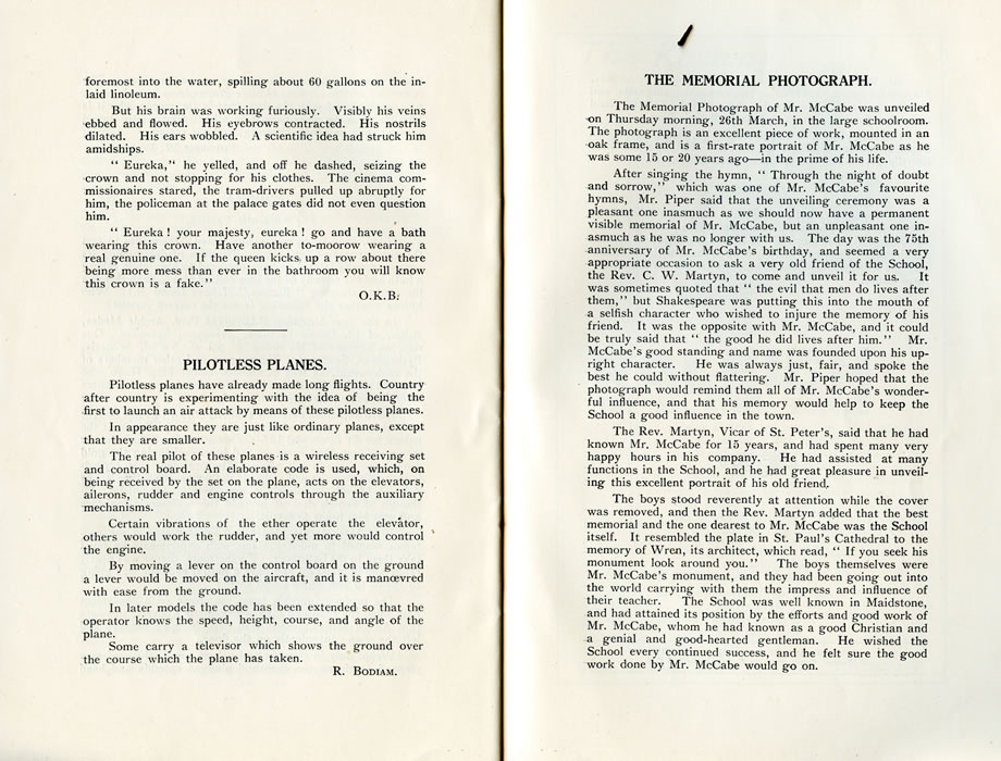 foremost into the water, spilling- about 60 gallons on the inlaid linoleum. But his brain was working furiously. Visibly his veins ebbed and flowed. His eyebrows contracted. His nostrils dilated. His ears wobbled. A scientific idea had struck him amidships. " Eureka," he yelled, and off he dashed, seizing the crown and not stopping for his clothes. The cinema commissionaires stared, the tram-drivers pulled up abruptly for him, the policeman at the palace gates did not even question him. " Eureka ! your majesty, eureka ! go and have a bath wearing this crown. Have another tomorrow wearing a real genuine one. If the queen kicks, up a row about there being more mess than ever in the bathroom you will know this crown is a fake." O.K.B. PILOTLESS PLANES.Pilotless planes have already made long flights. Country after country is experimenting with the idea of being the first to launch an air attack by means of these pilotless planes. In appearance they are just like ordinary planes, except that they are smaller. The real pilot of these planes is a wireless receiving set and control board. An elaborate code is used, which, on being received by the set on the plane, acts on the elevators, ailerons, rudder and engine controls through the auxiliary mechanisms. Certain vibrations of the ether operate the elevator, others would work the rudder, and yet more would control the engine. By moving a lever on the control board on the ground a lever would be moved on the aircraft, and it is manoeuvred with ease from the ground. In later models the code has been extended so that the operator knows the speed, height, course, and angle of the plane. Some carry a televisor which shows the ground over the course which the plane has taken. R. BODIAM. THE MEMORIAL PHOTOGRAPH.The Memorial Photograph of Mr. McCabe was unveiled on Thursday morning, 26th March, in the large schoolroom. The photograph is an excellent piece of work, mounted in an oak frame, and is a first-rate portrait of Mr. McCabe as he was some 15 or 20 years ago - in the prime of his life. After singing the hymn, " Through the night of doubt and sorrow," which was one of Mr. McCabe's favourite hymns, Mr. Piper said that the unveiling ceremony was a pleasant one inasmuch as we should now have a permanent visible memorial of Mr. McCabe, but an unpleasant one inasmuch as he was no longer with us. The day was the 75th anniversary of Mr. McCabe's birthday, and seemed a very appropriate occasion to ask a very old friend of the School, the Rev. C. W. Martyn, to come and unveil it for us. It was sometimes quoted that " the evil that men do lives after them," but Shakespeare was putting this into the mouth of a selfish character who wished to injure the memory of his friend. It was the opposite with Mr. McCabe, and it could be truly said that " the good he did lives after him." Mr. McCabe's good standing and name was founded upon his upright character. He was always just, fair, and spoke the best he could without flattering. Mr. Piper hoped that the photograph would remind them all of Mr. McCabe's wonderful influence, and that his memory would help to keep the School a good influence in the town. The Rev. Martyn, Vicar of St. Peter's, said that he had known Mr. McCabe for 15 years, and had spent many very happy hours in his company. He had assisted at many functions in the School, and he had great pleasure in unveiling this excellent portrait of his old friend. The boys stood reverently at attention while the cover was removed, and then the Rev. Martyn added that the best memorial and the one dearest to Mr. McCabe was the School itself. It resembled the plate in St. Paul's Cathedral to the memory of Wren, its architect, which read, " If you seek his monument look around you." The boys themselves were Mr. McCabe's monument, and they had been going out into the world carrying with them the impress and influence of their teacher. The School was well known in Maidstone, and had attained its position by the efforts and good work of Mr. McCabe, whom he had known as a good Christian and a genial and good-hearted gentleman. He wished the School every continued success, and he felt sure the good work done by Mr. McCabe would go on. |