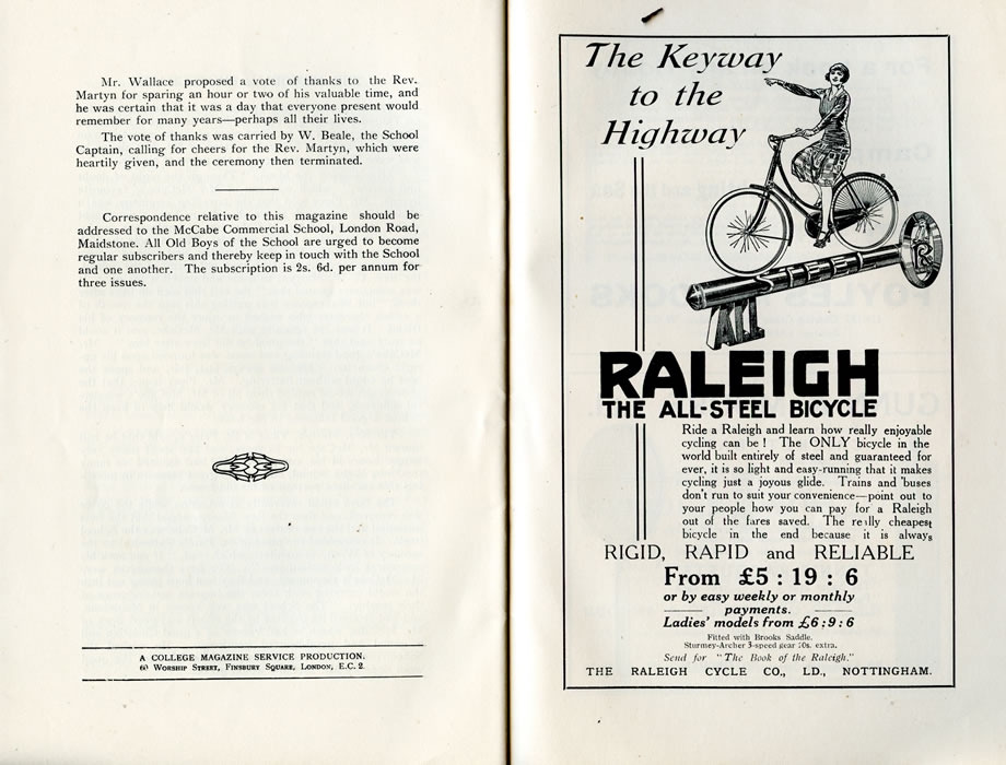 Mr. Wallace proposed a vote of thanks to the Rev. Martyn for sparing an hour or two of his valuable time, and he was certain that it was a day that everyone present would remember for many years—perhaps all their lives. The vote of thanks was carried by W. Beale, the School Captain, calling for cheers for the Rev. Martyn, which were heartily given, and the ceremony then terminated. Correspondence relative to this magazine should be addressed to the McCabe Commercial School, London Road, Maidstone. All Old Boys of the School are urged to become regular subscribers and thereby keep in touch with the School and one another. The subscription is 2s. 6d. per annum for three issues.