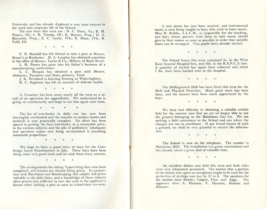 University and has already displayed a very keen interest in the work and corporate life of the School. The new boys this term are: D. C. Potts, Va ; R. H. Pearce, III; I. H. Thorpe, III; K. Bonner, Prep.; D. A. Reynolds, Prep.; E. C. Locke, IVb; E. Shaw, IVb; R. Yuill, III. F. N. Randall has left School to take a post at Messrs. Roote's at Rochester. M. A. Langley has obtained a position in the office of Messrs. Taylor & Co., Millers, of Bank Street. A. Croucher has been away nearly all the term as a result of an operation for appendicitis. We understand he is going on satisfactorily and hope to see him again next term. The list of text-books in daily use has now been thoroughly overhauled and the transfer to modern books and methods is now practically complete. No effort has been spared in getting the best text-books, at a, reasonable price, in the various subjects and the pile of publishers' catalogues and specimen copies now being accumulated is assuming mammoth proportions. We hope to have a good entry of boys for the Cambridge Local Examinations in July. These boys have been doing some very good work and we wish them every success. The arrangements for taking Typewriting have now been completed, and lessons are already being given. In conjunction with Shorthand and Bookkeeping this subject will prove valuable to the older boys, and a knowledge of these subjects often proves just sufficient to turn the scale in the applicant's favour when seeking a post as soon as school-days are over. A new piano has just been secured, and instrumental music is now being taught to boys who wish to learn music. Miss D. Stubbs, A.L.C.M., is responsible for the teaching, and boys whose parents wish them to take music should give in their names as soon as possible in order that suitable times can be arranged. Two pupils have already started. The School boxes this term contained 5s. in the West Kent General Hospital box, and 10d. in the R.S.P.C.A. box, A quantity of tin-foil has again been collected and about 7 lbs. have been handed over to the hospital. The Hollingworth Hall has been hired this term for the Drill and Physical Exercises. Much good work has been done, and the lessons have been much appreciated by the boys. We have had difficulty in obtaining a suitable cricket field for the summer now that we are no longer able to use the ground belonging to the Maidstone Gas Co. We are seeking a field convenient to the School and one where the charges are not to exorbitant. If any friend knows of such a ground, we shall be very grateful to receive the information. The School is now on the telephone. The number is Maidstone 2623. The installation is a great convenience and has already saved a great deal of valuable time. An excellent debate was held this term and both sides were very adequately presented. The motion that a portion of the money now spent on aeroplanes ought to be used for the perfection of airships was lost by 27 to 6. The speakers for the motion were Bowler, Tolputt, Finn and Apps. The opposers were A. Harman, F. Harman, Bodiam and Elbourn. |