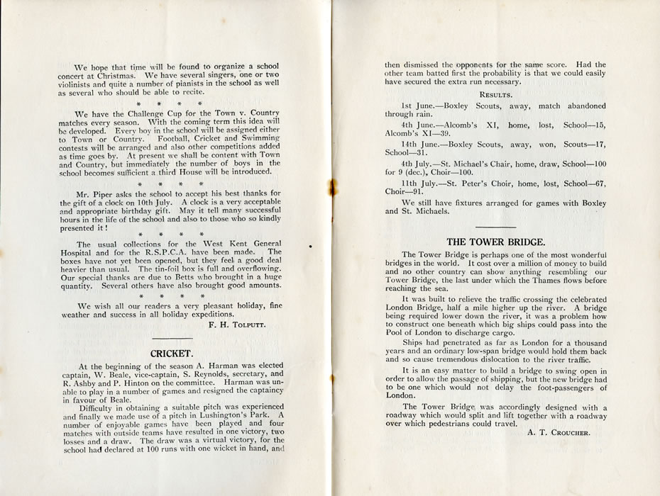 We hope that time will be found to organize a school concert at Christmas. We have several singers, one or two violinists and quite a number of pianists in the school as well as several who should be able to recite. We have the Challenge Cup for the Town v. Country matches every season. With the coming term this idea will be developed. Every boy in the school will be assigned either to Town or Country. Football, Cricket and Swimming contests will be arranged, and also other competitions added as time goes by. At present we shall be content with Town and Country, but immediately the number of boys in the school becomes sufficient a third House will be introduced. Mr. Piper asks the school to accept his best thanks for the gift of a clock on 10th July. A clock is a very acceptable and appropriate birthday gift. May it tell many successful hours in the life of the school and also to those who so kindly-presented it! The usual collections for the West Kent General Hospital and for the R.S.P.C.A. have been made. The boxes have not yet been opened, but they feel a good deal heavier than usual. The tin-foil box is full and overflowing. Our special thanks are due to Betts who brought in a huge quantity. Several others have also brought good amounts. We wish all our readers a very pleasant holiday, fine weather and success in all holiday expeditions. F. H. TOLPUTT. CRICKET.At the beginning of the season A. Harman was elected captain, W. Beale, vice-captain, S. Reynolds, secretary, and R. Ashby and P. Hinton on the committee. Harman was unable to play in a number of games and resigned the captaincy in favour of Beale. Difficulty in obtaining a suitable pitch was experienced and finally we made use of a pitch in Lushington's Park. A number of enjoyable games have been played and four matches with outside teams have resulted in one victory, two losses and a draw. The draw was a virtual victory, for the school had declared at 100 runs with one wicket in hand, and then dismissed the opponents for the same score. Had the other team batted first the probability is that we could easily have secured the extra run necessary. RESULTS.1st June. - Boxley Scouts, away, match abandoned through rain. 4th June.-Alcomb's XI, home, lost, School-15, Alcomb's XI-39. 14th June.-Boxley Scouts, away, won, Scouts-17, School-31. 4th July.-St. Michael's Chair, home, draw, School-100 for 9 (dec), Choir-100. 11th July.-St. Peter's Choir, home, lost, School-67, Choir-91. We still have fixtures arranged for games with Boxley and St. Michaels. THE TOWER BRIDGE.The Tower Bridge is perhaps one of the most wonderful bridges in the world. It cost over a million of money to build and no other country can show anything resembling our Tower Bridge, the last under which the Thames flows before reaching the sea. It was built to relieve the traffic crossing the celebrated London Bridge, half a mile higher up the river. A bridge being required lower down the river, it was a problem how to construct one beneath which big ships could pass into the Pool of London to discharge cargo. Ships had penetrated as far as London for a thousand years and an ordinary low-span bridge would hold them back and so cause tremendous dislocation to the river traffic. It is an easy matter to build a bridge to swing open in order to allow the passage of shipping, but the new bridge had to be one which would not delay the foot-passengers of London. The Tower Bridge, was accordingly designed with a roadway which would split and lift together with a roadway over which pedestrians could travel. A. T. CROUCHER. |