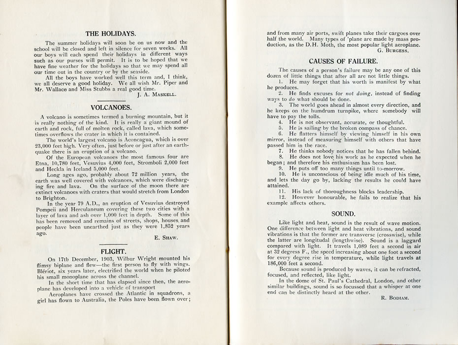 THE HOLIDAYS.The summer holidays will soon be on us now and the school will be closed and left in silence for seven weeks. All our boys will each spend their holidays in different ways such as our purses will permit. It is to be hoped that we have fine weather for the holidays so that we may spend all our time out in the country or by the seaside. All the boys have worked well this term and, I think, we all deserve a good holiday. We all wish Mr. Piper and Mr. Wallace and Miss Stubbs a real good time. J. A. MASKELL. VOLCANOES.A volcano is sometimes termed a burning mountain, but it is really nothing of the kind. It is really a giant mound of earth and rock, full of molten rock, called lava, which sometimes overflows the crater in which it is contained. The world's largest volcano is Aconcagua, which is over 23,000 feet high. Very often, just before or just after an earthquake there is an eruption of a volcano. Of the European volcanoes the most famous four are Etna, 10,780 feet, Vesuvius 4,000 feet, Stromboli 2,000 feet and Heckla in Iceland 5,000 feet. Long ages ago, probably about 72 million years, the earth was well covered with volcanoes, which were discharging fire and lava. On the surface of the moon there are extinct volcanoes with craters that would stretch from London to Brighton. In the year 79 A.D., an eruption of Vesuvius destroyed Pompeii and Herculaneum covering these two cities with a layer of lava and ash over 1,000 feet in depth. Some of this has been removed and remains of streets, shops, houses, and people have been unearthed just as they were 1,852 years E. SHAW. FLIGHT.On 17tb December, 1903, Wilbur Wright mounted his flimsy biplane and flew-the first person to fly with wings. Bleriot, six years later, electrified the world when he piloted his small monoplane across the channel. In the short time that has elapsed since then, the aeroplane has developed into a vehicle of transport Aeroplanes have crossed the Atlantic in squadrons, a girl has flown to Australia, the Poles have been flown over; and from many air ports, swift planes take their cargoes over half the world. Many types of 'plane are made by mass production, as the D.H. Moth, the most popular light aeroplane. G. BURGESS. CAUSES OF FAILURE.The causes of a person's failure may be any one of this dozen of little things that after all are not little things. 1. He may forget that his worth is manifest by what he produces. 2. He finds excuses for not doing, instead of finding ways to do what should be done. 3. The world goes ahead in almost every direction, and he keeps on the humdrum turnpike, where somebody will have to pay the tolls. 4. He is not observant, accurate, or thoughtful. 5. He is sailing- by the broken compass of chance. 6. He flatters himself by viewing himself in his own mirror, instead of measuring himself with others that have passed him in the race. 7. He thinks nobody notices that he has fallen behind. 8. He does not love his work as he expected when he began; and therefore his enthusiasm has been lost. 9. He puts off too many things until to-morrow. 10. He is unconscious of being idle much of his time, and lets the day go by, lacking the results he could have attained. 11. His lack of thoroughness blocks leadership. 12. However honourable, he fails to realize that his example affects others. SOUND.Like light and heat, sound is the result of wave motion. One difference between light and heat vibrations, and sound vibrations is that the former are transverse (crosswise), while the latter are longitudal (lengthwise). Sound is a laggard compared with light. It travels 1,089 feet a second in air at 32 degrees F., the speed increasing about one foot a second for every degree rise in temperature, while light travels at 186,000 feet a second. Because sound is produced by waves, it can be refracted, focused, and reflected, like light. In the dome of St. Paul's Cathedral, London, and other similar buildings, sound is so focussed that a whisper at one end can be distinctly heard at the other. R. BODIAM. |