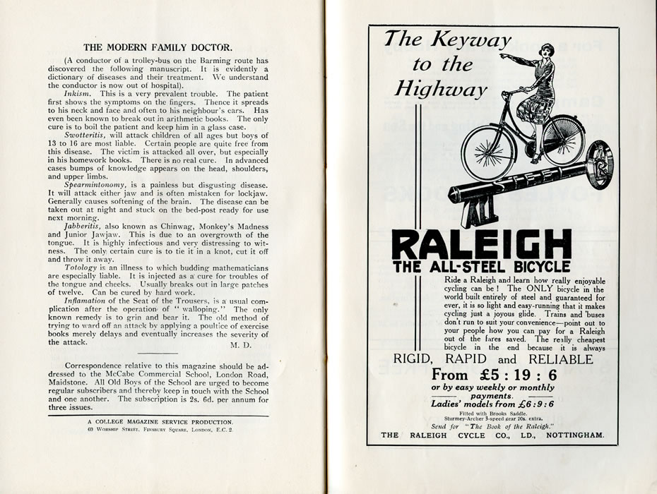 THE MODERN FAMILY DOCTOR.(A conductor of a trolley-bus on the Barming route has discovered the following' manuscript. It is evidently a dictionary of diseases and their treatment. We understand the conductor is now out of hospital). Inkism. This is a very prevalent trouble. The patient first shows the symptoms on the fingers. Thence it spreads to his neck and face and often to his neighbour's ears. Has even been known to break out in arithmetic books. The only cure is to boil the patient and keep him in a glass case. Swotteritis, will attack children of all ages but boys of 13 to 1G are most liable. Certain people are quite free from this disease. The victim is attacked all over, but especially in his homework books. There is no real cure. In advanced cases bumps of knowledge appears on the head, shoulders, and upper limbs. Spearmintonomy, is a painless but disgusting disease. It will attack either jaw and is often mistaken for lockjaw. Generally causes softening of the brain. The disease can be taken out at night and stuck on the bed-post ready for use next morning. Jabberitis, also known as Chinwag, Monkey's Madness and Junior Jawjaw. This is due to an overgrowth of the tongue. It is highly infectious and very distressing to witness. The only certain cure is to tie it in a knot, cut it off and throw it away. Totology is an illness to which budding mathematicians are especially liable. It is injected as a cure for troubles of the tongue and cheeks. Usually breaks out in large patches of twelve. Can be cured by hard work. Inflamation of the Seat of the Trousers, is a usual complication after the operation- of " walloping." The only known remedy is to grin and bear it. The old method of trying to ward off an attack by applying a poultice of exercise books merely delays and eventually increases the severity of the attack. M.D. Correspondence relative to this magazine should be addressed to the McCabe Commercial School, London Road, Maidstone. All Old Boys of the School are urged to become regular subscribers and thereby keep in touch with the School and one another. The subscription is 2s. 6d. per annum for three issues. A COLLEGE MAGAZINE SERVICE PRODUCTION. 60 WORSHIP STREET. FINSBURY SQUARE, LONDON. E.C. 2. |