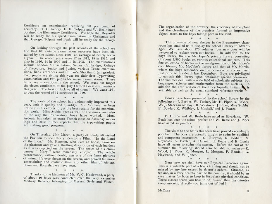 Certificate - an examination requiring 98 per cent, of accuracy. T. C. George, F. H. Tolputt and W. Beale have obtained the Elementary Certificate. We hope that Reynolds will be ready for his speed examination by Christmas and that George, Tolputt and Beale will be ready for the theory. On looking through the past records of the school we find that 181 outside examination successes have been obtained by the school since 1904, an average of nearly seven a year. The record years were 17 in 1912, 15 in 1915, and also in 1916, 14 in 1909 and 13 in 1905. The examinations include London Matriculation, Senior Cambridge, College of Preceptors, Senior and Junior, various Trade examinations, Bank entrances and Pitman's Shorthand (all grades). Two pupils are sitting this year for their first Typewriting examination and two pupils for music examinations. These latter are innovations in the school. We must not forget the eleven candidates at the July Oxford Local examinations this year. The best of luck to all of them! We want 1931 to beat the record of 17 successes in 1912. The work of the school has undoubtedly improved this year, both in quality and quantity. Mr. Wallace has been untiring in his efforts to get the best results for the examination work. Miss Stubbs speaks well of the music and also of the way the Preparatory boys have worked. Mon. Ardontz has taken an extra French class on Saturday mornings and Miss Filmer reports that the typewriting pupils are making good progress. On Thursday, 26th March, a party of nearly 50 visited the Pavilion to see Cherry Kearton's Film, " In the Land of the Lion." Mr. Kearton, who lives at Loose, came on the platform and gave a thrilling description of each incident as it was depicted on the screen. The antics of his chimpanzee, " Mary," were immensely enjoyed. The whole performance, without doubt, was one of the finest pictures of animal life ever shown on the screen, and proved far more entertaining and realistic than any other film of African fauna and flora that we have seen. Thanks to the kindness of Mr. V. C. Haslewood, a party of about 40 boys was conducted over the very extensive Medway Brewery belonging to Messrs. Style and Winch. The organization of the brewery, the efficiency of the plant and the cleanliness of the premises formed an impressive object-lesson to the boys taking part in the visit. The provision of new shelves in the Preparatory classroom has enabled us to display the school Library to advantage. We have about 170 volumes, but new ones will be welcomed to replace worn-out books. In addition to the boy’s library, there is Mr. Piper's private library, consisting of about 1,500 books on various educational subjects. This fine collection of books is the amalgamation of Mr. Piper's own library, Mr. McCabe's library and that of Mr. Morris, whom the boys remember on the occasion of a short visit just prior to his death last December. Boys are privileged to consult this library upon obtaining special permission. The volumes deal with a wide field of scholastic subjects, but languages, science and mathematics form the nucleus. In addition, the 13th edition of the Encyclopaedia Britannica is available as well as the usual standard reference works. Books have been presented to the school library by the following : - J. Barker, W. Tucker, Mr. H. Piper, A. Baxter, W. J. Steer (an old boy), B. Westover, J. Piper, Miss Stubbs, E. Bowler, K. Whibley, J. Maskell, and J. Pearce. P. Hinton and W. Beale have acted as librarians. W. Beale has been the school prefect and W. Beale and J. Piper have acted as janitors. The visits to the baths this term have proved exceedingly popular. The boys are actually taught to swim by qualified and competent instructors. G. Burgess, R. Bodiam, S. Reynolds, A. Baxter, A. Harman, J. Beale and E. Locke have all learnt to swim this season. Before the end of the summer the following should also be able to swim: - R. Wood, J. Piper, K. Morgan, L. Morgan, P. Randall, G. Haywood, and W. Jones. Next term we shall have our Physical Exercises again. This is a valuable part of a boy's training and should not be missed by any boy except by doctor's orders. Situated, as we are, in a very healthy part of the country, it should be an easy matter for boys to keep in first-class physical condition. These classes teach you how to do it - and then ten minutes every morning directly you jump out of bed! |