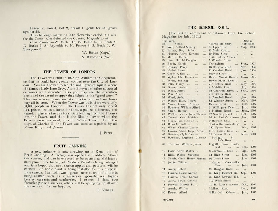 Played 7, won 4, lost 2, drawn 1, goals for 49, goals against 22. The challenge match on 20th November ended in a win for the Town, who defeated the Country 10 goals to nil. Goal Scorers. - W. Welch 15, W. Beale 14, L. Beale 2, E. Butler 5, S. Reynolds 9, H. Pearce 3, S. Beale 3, W. Spurgeon 3. W. BEALE (Capt.). S. REYNOLDS (Sec). THE TOWER OF LONDON.The Tower was built in 1078 by William the Conqueror, so that he could have greater control over the City of London. You are allowed to see the small granite square where the famous Lady Jane Grey, Anne Boleyn and other supposed criminals were executed, also you may see the execution block and the actual chopper that helped in the "good work. " There are also many instruments of torture and such machines may all be seen. When the Tower was built there were only 30,000 people in London. The Tower has not only served as a prison, but as a home for lions, a palace, a fortress, and a mint. There is the Traitors' Gate leading from the Thames into the Tower, and there is the Bloody Tower where the Princes were murdered, also the White Tower. Until the reign of Charles II, the Tower was used as a palace by all of our Kings and Queens. J. PIPER. FRUIT CANNING.A new industry is now growing up in Kent - that of Fruit Canning. A factory was opened at Paddock Wood this season, and one is expected to be opened at Maidstone next year. The factory at Paddock Wood is being enlarged and it is hoped that next season apples and potatoes will be canned. An apple plant is being installed for this purpose. Last season, I am told, was a great success, fruit of all kinds being canned, such as strawberries, gooseberries, logan¬berries, currants and raspberries. I expect if these two factories prove a success, others will be springing up all over the country. Let us hope so. F. VlDLER. THE SCHOOL ROLL.(The first 40 names can be obtained from the School Magazine for July, 1931.) Admission Date of No, Name, Address on Entry, Admission. 41, Well, Wilfred Standly, 83 Upper Fant, May 1903 42, Palmer, Reg. Arthur, 83 Muir Road, May, 1903 43, Honour, Alfred Edward, 40 King Street, May 1903 44, Martin, Herbert, 8 St. Luke's Avenue, May 1903 45, Burr, Harold Douglas, 7 Wheeler Street, May 1903 46, Booth, Harold, Friningham, Sept. 1903 47, Rumsey, Percy, 13 Douglas Road, Nov 1903 48, Nickel, Ernest, 41 Cambell Road, Jan. 1904 49, Gardner, Eric, Brewer Street, Jan. 1904 50, Wyles, John Dennis, Bower Mount Road, Mar. 1904 51, Wyles, Stanleigh, Bower Mount Road, Mar. 1904 52, Pike, Harry, 217 Boxley Road, May 1904 53, Boakes, Arthur, 4 Melville Road, July 1904 54, Walls, Alfred, 38 Charlton Street, Sept. 1904 55, Pike, Alfred, 217 Boxley Road, Sept. 1904 56, Ward, Arthur, 4 Campbell Road, Jan. 1905 57, Waters, Robt, George, 83 Wheeler Street, May 1905 58, Munn, Leonard Stanley, Bower Street, June 1905 59, Buekoke, William Alfred, 2 Willington Road, July 1905 60, Smith, Herbert, 1 Holland Road, Sept. 1905 61, Walker, Victor John Thomas, 27 Sandling Road, Oct. 1905 62, Trowell, Cecil Hobday, 16 St. Luke's Avenue, Jan. 1906 63, Stone, James Major, 9 Rawdon Road, Jan. 1906 64, Bushell, Basil, Station Ho., nr. Malling, Jan. 1906 65, White, Charles Walter, 280 Upper Fant, Feb. 1906 66, Harris, Albert Edgar Cyril, 6 St. Luke's Road, Feb. 1906 67, Graham, Clyde Stewart, 19 Brewer Street, Mar. 1906 68, Boorman, Reginald Clarence, "Swingcot," St. Luke’s Road, Mar. 1906 69, Thomson, William James, Gighill Farm, Larkfield, Apl. 1906 70, Hoar, Alfred Walter, 8 Cornwallis Road, Apl. 1906 71, Rich, Walter Augustus, 54 High Street, June 1906 72, Nesbit, Chas. Henry Fletcher, 96 Week Street, June 1906 73, Joliffe, William "Medina,"Cornwallis, Road, July 1906 74, Avery, Robert, 2a Douglas Road, July 1906 75, Harvey, Leslie Gordon, 39 King Edward Rd., Sept. 1906 76, Harvey, Frank Gordon, 39 King Edward Rd., Sept. 1906 77, Avery, Edwin Charles, 102 Week Street, Sept. 1906 78, Frowell, Harold P., 16 St. Luke's Avenue, Oct. 1906 79, Arnold, Wilfred, Holland Road, Dec. 1906 80, Reeves, Alfred, Bilks Coll., Otham, Jan. 1907 |
