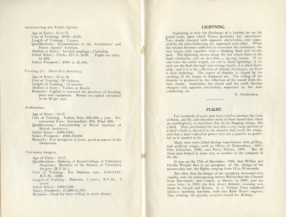 LIGHTNING.Lightning is only the discharge of a Leyden jar on the grand scale, upon which Nature performs her operations. Two clouds charged with opposite electricities, and separated by the non-conducting air, approach each other. When the tension becomes sufficient to overcome the resistance, the two forces rush together with a blinding flash and terrific peal. The lightning moves along the line where there is the least resistance, and so describes a zig-zag course. If we can trace the entire length, we call it chain lightning; if we only see the flash through intervening clouds, it is sheet lightening ; and if it is the reflection of distant discharges, we term it heat lightning. The report of thunder is caused by the clashing of the atoms of displaced air. The rolling of the thunder is produced by the reflection of the sound from distant clouds. Sometimes the clouds and the earth become charged with opposite electricities, separated by the nonconducting air. G. GOODCHILD. FLIGHT.For hundreds of years men have tried to emulate the feats of birds, and fly, and therefore most of them based their ideas on ornithoptors, or machines that fly by flapping wings, like a bird. They overlooked the fact that a very large portion of a bird's body is devoted to the muscles that work the wings, and that a man's physical power was not a quarter as powerful as it needed to be. Many men were killed during experiments with gliding, and artificial wings, such as Oliver of Malmesbury, 1065 ; Otto Lilienthal, 1896; and Percy Pilcher, 1899. ' But all these men helped in some way or another in the conquest of the air. It was on the 17th of December, 1903, that Wilbur and Orville Wright flew in an aeroplane of the design of the present-day one, the flights ranging from 12 to 59 seconds. But after that the design of the aeroplane increased very rapidly, only six years passing before Bleriot flew the Channel from Barraques, near Calais, to Dover, in 1909, and ten years later, in 1919, the first direct Atlantic crossing was made by Alcock and Brown, in a Vickers Vimy standard military bombing machine, with two Rolls Royce engines, thus winning the greatly coveted record for Britain. |