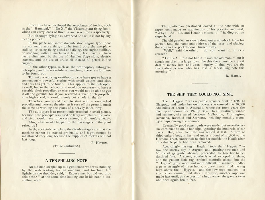 From this have developed the aeroplanes of to-day, such as the "Hannibal," " Do X," the Vickers giant flying boat, which can carry loads of three, 5 and seven tons respectively. But although flying has advanced so far, it is not by any means perfect. In the plane and internal-combustion engine type there are not many more things to be found out; the aeroplane stalling, or losing flying speed and diving, the engine stalling, or stopping without mechanical failure, fire, have all been partly eliminated by the use of Handley-Page slots, electric starters, and the use of crude oil instead of petrol in the engines. In the other types, such as the ornithoptor, auto-gyro, helicoptor, and the rocket-driven machine, there is a lot more to be found out. To make a working ornithoptor, you have got to have a tremendously powerful engine with small weight and size, and this has yet to be found. This applies to the helicoptor as well, but in the helicoptor it would be necessary to have a variable pitch propeller, or else you would not be able to get it off the ground, for if you revolved a fixed pitch propeller at a high speed, it would merely cut a hole in the air. Therefore you would have to start with a low-pitched propeller and increase the pitch as it rose off the ground, much the same as working the gears of a heavily-laden lorry. The auto-gyro is at present only practical in small planes, because if the principle was used on large aeroplanes, the rotor and pivot would have to be very strong and therefore heavy. Also, what would happen to the passengers if the pivot seized up ! In the rocket-driven plane the disadvantages are that the machine cannot be started gradually, and flight cannot be maintained very long because the supplies of rockets will not last long. P. HIXTOX. (To be continued.) A TEN-SHILLING NOTE.An old man stepped up to a gentleman who was standing by the kerb waiting for an omnibus, and touching him lightly on the shoulder, said, " Excuse me, but did you drop this note? " at the same time holding out in his hand a ten-shilling note. The gentleman questioned looked at the note with an eager look, made an examination of his pockets, and said, "Why ! So I did, and I hadn't missed it ! " holding out an eager hand. The old gentleman slowly drew out a note-book from his pocket, took the name and address of the loser, and placing the note in the pocket-book, turned away. "Well," said the other, " do you want it all as a reward? " " Oh, no ! I did not find it," said the old man, " but it struck me that in a large town like this there must be a great deal of money lost, and upon inquiry I find you are the twenty-first person who has lost a ten-shilling note this morning.'' R. HARLE. THE SHIP THEY COULD NOT SINK.The " Hygeia " was a paddle steamer built in 1890 at Glasgow, and under her own power she crossed the 20,000 odd miles of ocean to Australia, where for forty years she plied up and down Port Phillip Bay. In all weathers, winter and summer, she sailed between Melbourne, Mornington, Dromana, Rosebud and Sorrento, including monthly moon-light trips during the summer. Eventually good coast roads were made, but nevertheless she continued to make her trips, ignoring the hundreds of car users. But, alas ! her fate was sealed at last. A firm of shipbreakers bought her, and under a bond of £l,000_to the Harbour Trust, undertook to sink her outside the Heads after all valuable parts had been removed. Accordingly the tug " Eagle " took the " Hygeia " in tow one stormy day in August, and, putting two men and 50 lbs. of gelignite aboard, proceeded to tow her to her destined fate. A strong southerly wind swooped on them, and the gallant little tug strained manfully ahead, but the " Hygeia" grew more and more difficult to manage. After a grim struggle of three hours, a great wave lifted the tug high above the " Hygeia," and the tow-rope snapped. A stern chase ensued, and after a struggle, another rope was made fast until, on the crest of a huge wave, she gave a twist and once again broke free. |