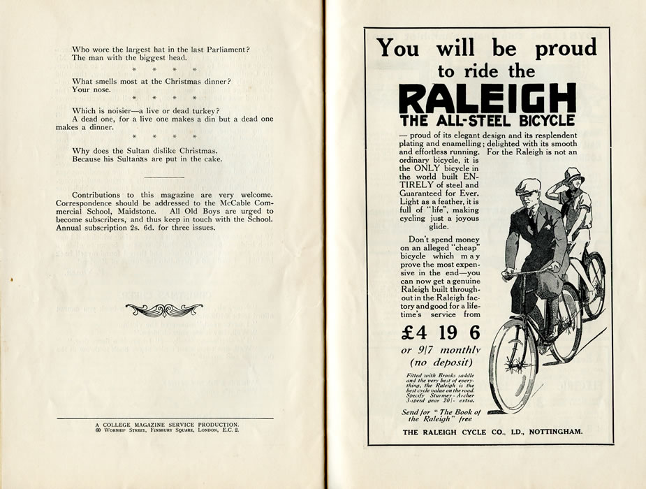 Who wore the largest hat in the last Parliament? What smells most at the Christmas dinner? Which is noisier - a live or dead turkey ? Why does the Sultan dislike Christmas. Contributions to this magazine are very welcome. Correspondence should be addressed to the McCable Commercial School, Maidstone. All Old Boys are urged to become subscribers, and thus keep in touch with the School. Annual subscription 2s. 6d. for three issues. A COLLEGE MAGAZINE SERVICE PRODUCTION. |