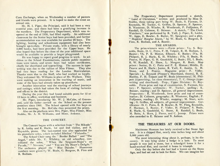 Corn Exchange, when on Wednesday a number of parents and friends were present. It is hoped to make the event an annual one. Mr. H. I. Piper, the Principal, said it had been a very eventful year, and there had been a gratifying increase in the numbers. The Preparatory Department, which was re-opened at the end of 1930, had filled rapidly. An additional classroom for the Senior boys had been provided, and further accommodation was now available for another 20 boys. The lighting, heating and schoolroom equipment had also been brought up-to-date. Private study, with a library of nearly 2,000 books, had been provided for the Upper boys. He also hoped that before the close of the year additional space would be available to provide a larger playground. He was happy to report good progress in work. In addition to the School Examinations, outside public examinations were taken, and seven boys had taken certificates, chiefly for shorthand and typewriting. The success in type-writing was due to the tuition of Miss Filmer. They also had two boys reading for the London Matriculation. Thanks were due to the Staff, who had worked so loyally. They welcomed Mr. Williams in place of Mr. Wallace. They were making an innovation in the teaching of music, and some of the boys had already taken up pianoforte. Another innovation was the starting of school journeys and outings, which had taken the form of visiting factories and offices in the district. During the year they had found suitable posts for 12 or 13 boys in office, workshop and business. Mr. Piper, introducing Mr. W. J. McCabe, of Gravesend, said his father carried on the School on the present premises since 1901. The School opened with five boys on the first morning. Mr. McCabe then presented the prizes. Also on the platform were Mrs. Piper, Miss Filmer, Miss Slubbs, Mr. A. M. Williams, and Mons. Ardontz. THE CONCERT.The Concert began with a selection from " The Mikado" by R- Ashby and R. Harle, 1st and 2nd violins, and S. Reynolds, piano. The last-named was also applauded for his pianoforte solos, which included Sibelius' "Finlandia." The School Choir sang the "Border Ballad" and "The Angel," while Mr. V. Whibley, an old schoolboy, contributed the solos, " When the Sergeant-Major's on Parade," " Nirvana," and " You are My Heart's Delight." The orchestra played the " Blue Danube." Humorous numbers were given by W, Beale, G, Burgess, B. Finn and R, Bodiam. The Preparatory Department presented a sketch, " Land of Christmas," written and produced by Miss D. Stubbs, those taking part being W. Beale, S. Farman, D. Reynolds, W. Tucker, G. Griffen, D. Spencer, P. Spencer, B. Westover, D. Winder, R. Westbrook, P. Fulljames, P. Randall, D. Colinese, E. Skinner. A sketch, " The Clock Watchers," was performed by R. Yuill, J. Piper, E. Locke, W. Apps, E. Bowler, E. Butler, W. Spurgeon ; and a play, " Hopkins' Burglar Alarm," by W. Beale, G. Burgess, B. Finn, R. Bodiam, and A. Baxter. THE AWARDS.The prize-winners were :-Form prizes : Va, S. Reynolds, Beale, D. C. Potts, F. H. Tolputt, R. H. Bodiam, A. Baxter; Vb, P. E. Hinton, Elbourn, E. Butler; IVa, H. Philpott, R. J. Harle, K. H. Whibley; IVb, S. Beale, H. Pearce, H. Piper, G. H. Goodchild, L. Beale; III, I. Beale, R. W. Randall, E. Shaw, L. Morgan, R. Brett. Map prizes: Senior, D. C. Potts and P. E. Hinton; Middle, H. Pearce and R. Harle; Junior, R. Yuill, E. Austin, G. H. Stone, and J. Pearce. Magazine prize: F. Vidler. Specials : L. Reynold (Pitman's Shorthand, theory), R. E. Bushby, F. H. Tolputt and W. Beale (elementary); H. Philpott (typewriting, 1st class elementary), T. C. George (typewriting and shorthand). Prep., Upper Division : D. Reynolds. Form prize and top of examination, S. Farman, history ; P. Spencer, arithmetic; W. Tucker, spelling; K. Bonner, reading; and D. Spencer, all general improvement. Preparatory : R. Westbrook, form prize and top of examination ; D. Colinese, geography ; B. Westover, English ; P. Fulljames, reading; D. Winder, mapping; M. Sturt, writing ; G. Griffen, all subjects, all general improvement. Certificates : D. C. Potts, E. B. Bowler, B. W. Finn, Reynolds, F. Harman, A. Baxter, F. Vidler, H. Philpott, S. Beale, R. Harle, G. Goodchild, G. Stone, R. Randall, L. Beale, M. Betts, A. Horn, J. Pierce, and C. Jessup. Prizes were also awarded to E. Skinner and N. Ashton. THE TREASURES AT OUR DOORS.Maidstone Museum has lately received a fine Stone Age axe. It is a chipped flint, nearly nine inches long and about 5,000 years old. The most interesting thing about it, perhaps, is its discovery. It was lying under a hedge in a lane. To most people it was just a stone, but a schoolgirl knew it for a hand-worked flint, and carried it home in triumph. Only the day before she had had a lesson on the Stone Age, and had set out to look for flints. We can imagine her |