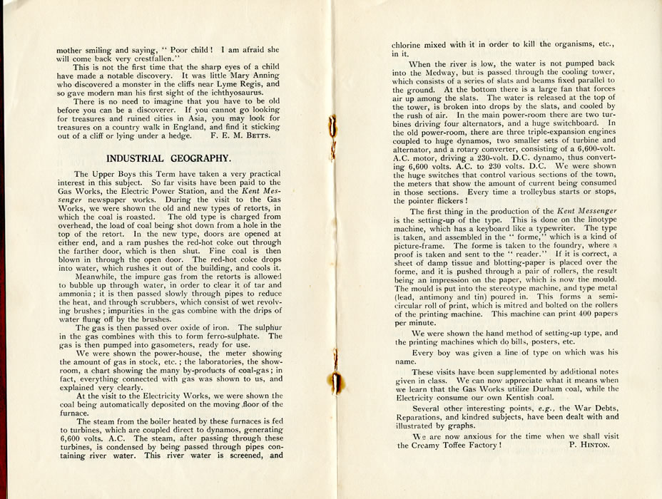 mother smiling and saying, "Poor child ! I am afraid she will come back very crestfallen." This is not the first time that the sharp eyes of a child have made a notable discovery. It was little Mary Anning who discovered a monster in the cliffs near Lyme Regis, and so gave modern man his first sight of the ichthyosaurus. There is no need to imagine that you have to be old before you can be a discoverer. If you cannot go looking for treasures and ruined cities in Asia, you may look for treasures on a country walk in England, and find it sticking out of a cliff or lying under a hedge F. E. M. BETTS. INDUSTRIAL GEOGRAPHY.The Upper Boys this Term have taken a very practical interest in this subject. So far visits have been paid to the Gas Works, the Electric Power Station, and the Kent Messenger newspaper works. During the visit to the Gas Works, we were shown the old and new types of retorts, in which the coal is roasted. The old type is charged from overhead, the load of coal being shot down from a hole in the top of the retort. In the new type, doors are opened at either end, and a ram pushes the red-hot coke out through the farther door, which is then shut. Fine coal is then blown in through the open door. The red-hot coke drops into water, which rushes it out of the building, and cools it. Meanwhile, the impure gas from the retorts is allowed to bubble up through water, in order to clear it of tar and ammonia; it is then passed slowly through pipes to reduce the heat, and through scrubbers, which consist of wet revolving brushes; impurities in the gas combine with the drips of water flung off by the brushes. The gas is then passed over oxide of iron. The sulphur in the gas combines with this to form ferro-sulphate. The gas is then pumped into gasometers, ready for use. We were shown the power-house, the meter showing the amount of gas in stock, etc. ; the laboratories, the showroom, a chart showing the many by-products of coal-gas; in fact, everything connected with gas was shown to us, and explained very clearly. At the visit to the Electricity Works, we were shown the coal being automatically deposited on the moving floor of the furnace. The steam from the boiler heated by these furnaces is fed to turbines, which are coupled direct to dynamos, generating 6,600 volts. A.C. The steam, after passing through these turbines, is condensed by being passed through pipes containing river water. This river water is screened, and chlorine mixed with it in order to kill the organisms, etc., in it. When the river is low, the water is not pumped back into the Medway, but is passed through the cooling tower, which consists of a series of slats and beams fixed parallel to the ground. At the bottom there is a large fan that forces air up among the slats. The water is released at the top of the tower, is broken into drops by the slats, and cooled by the rush of air. In the main power-room there are two turbines driving four alternators, and a huge switchboard. In the old power-room, there are three triple-expansion engines coupled to huge dynamos, two smaller sets of turbine and alternator, and a rotary converter, consisting of a 6,600-volt. A.C. motor, driving a 230-volt. D.C. dynamo, thus converting 6,600 volts. A.C. to 230 volts. D.C. We were shown the huge switches that control various sections of the town, the meters that show the amount of current being consumed in those sections. Every time a trolleybus starts or stops, the pointer flickers! The first thing in the production of the Kent Messenger is the setting-up of the type. This is done on the linotype machine, which has a keyboard like a typewriter. The type is taken, and assembled in the "forme," which is a kind of picture-frame. The forme is taken to the foundry, where a proof is taken and sent to the " reader." If it is correct, a sheet of damp tissue and blotting-paper is placed over the forme, and it is pushed through a pair of rollers, the result being an impression on the paper, which is now the mould. The mould is put into the stereotype machine, and type metal (lead, antimony and tin) poured in. This forms a semicircular roll of print, which is mitred and bolted on the rollers of the printing machine. This machine can print 400 papers per minute. We were shown the hand method of setting-up type, and the printing machines which do bills, posters, etc. Every boy was given a line of type on which was his name. These visits have been supplemented by additional notes given in class. We can now appreciate what it means when we learn that the Gas Works utilize Durham coal, while the Electricity consume our own Kentish coal. Several other interesting points, e.g., the War Debts, Reparations, and kindred subjects, have been dealt with and illustrated by graphs. We are now anxious for the time when we shall visit the Creamy Toffee Factory! P. HINTON. |
