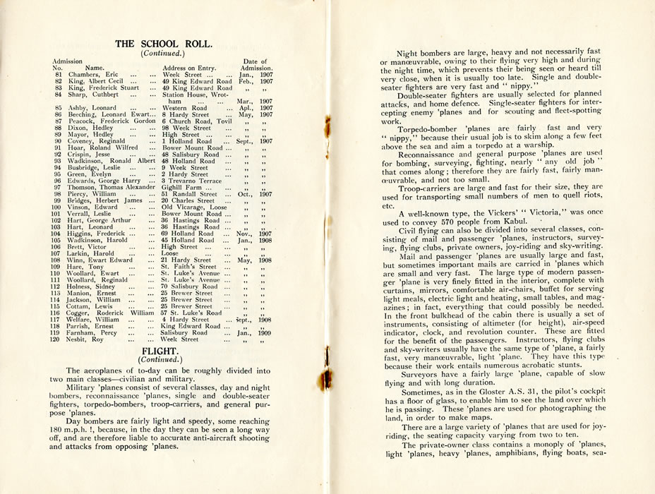 THE SCHOOL ROLL.(Continued.)Admission No., Name. Address on Entry. Date of Admission. 81, Chambers, Eric, Week Street, Jan.,1907 82, King, Albert Cecil, 49 King Edward Road, Feb., 1907 83, King, Frederick Stuart, 49 King Edward Road, Feb., 1907 84, Shaip, Cuthbert, Station House, Wrotham, Mar., 1907 85, Ashby, Leonard, Western Road, Apl., 1907 86, Beeching, Leonard Ewart, 8 Hardy Street, May, 1907 87, Peacock, Frederick Gordon, 6 Church Road, Tovil, May, 1907 88, Dixon, Hedley, 98 Week Street, May, 1907 89, Mayor, Hedley, High Street, May, 1907 90, Coveney, Reginald, 1 Holland Road, Sept., 1907 91, Hoar, Roland Wilfred, Bower Mount Road, Sept., 1907 92, Crispin, Jesse, 48 Salisbury Road, Sept., 1907 93, Wadkinson, Ronald Albert, 48 Holland Road, Sept., 1907 94, Busbridge, Leslie, 9 Week Street, Sept., 1907 95, Green, Evelyn, 2 Hardy Street, Sept., 1907 96, Edwards, George Harry, 3 Trevarno Terrace, Sept., 1907 97, Thomson, Thomas Alexander, Gighill Farm, Sept., 1907 98, Piercy, William, 51 Randall Street, Oct., 1907 99, Bridges, Herbert James, 20 Charles Street, Oct., 1907 100, Vinson, Edward, Old Vicarage, Loose, Oct., 1907 101, Verrall, Leslie, Bower Mount Road, Oct., 1907 102, Hart, George Arthur, 36 Hastings Road, Oct., 1907 103, Hart, Leonard, 36 Hastings Road, Oct., 1907 104, Higgins, Frederick, 69 Holland Road, Nov., 1907 105, Wadkinson, Harold, 45 Holland Road, Jan., 1908 106, Brett, Victor, High Street, Jan., 1908 107, Larkin, Harold, Loose, Jan., 1908 108, Winn, Ewart Edward, 21 Hardy Street, May 1908 109, Hare, Tony, St. Faith's Street, May 1908 110, Woollard, Ewart, St. Luke's Avenue, May 1908 111, Woollard, Reginald, St. Luke's Avenue, May 1908 112, Holness, Sidney, 70 Salisbury Road, May 1908 113, Manion, Ernest, 25 Brewer Street, May 1908 114, Jackson, William, 25 Brewer Street, May 1908 115, Cottam, Lewis, 25 Brewer Street, May 1908 116, Cogger, Roderick William, 57 St. Luke's Road, May 1908 117, Welfare, William, 4 Hardy Street, Sept., 1908 118, Parrish, Ernest, King Edward Road, Sept., 1908 119, Farnham, Percy, Salisbury Road, Jan., 1909 120, Nesbit, Roy-, Week Street, Jan., 1909 FLIGHT.(Continued.)The aeroplanes of to-day can be roughly divided into two main classes-civilian and military. Military 'planes consist of several classes, day and night bombers, reconnaissance 'planes, single and double-seater fighters, torpedo-bombers, troop-carriers, and general purpose 'planes. Day bombers are fairly light and speedy, some reaching 180 m.p.h. !, because, in the day they can be seen a long way off, and are therefore liable to accurate anti-aircraft shooting and attacks from opposing 'planes. Night bombers are large, heavy and not necessarily fast or manoeuvrable, owing to their flying very high and during the night time, which prevents their being seen or heard till very close, when it is usually too late. Single and double-seater fighters are very fast and " nippy." Double-seater fighters are usually selected for planned attacks, and home defence. Single-seater fighters for intercepting enemy 'planes and for scouting and fleet-spotting work. Torpedo-bomber 'planes are fairly fast and very " nippy," because their usual job is to skim along a few feet above the sea and aim a torpedo at a warship. Reconnaissance and general purpose 'planes are used for bombing, surveying, fighting, nearly any old job that comes along; therefore they are fairly fast, fairly manoeuvrable, and not too small. Troop-carriers are large and fast for their size, they are used for transporting small numbers of men to quell riots, etc. A well-known type, the Vickers' " Victoria," was once used to convey 570 people from Kabul. Civil flying can also be divided into several classes, consisting of mail and passenger 'planes, instructors, surveying, flying clubs, private owners, joy-riding and sky-writing. Mail and passenger 'planes are usually large and fast, but sometimes important mails are carried in 'planes which are small and very fast. The large type of modern passenger 'plane is very finely fitted in the interior, complete with curtains, mirrors, comfortable air-chairs, buffet for serving light meals, electric light and heating, small tables, and magazines ; in fact, everything that could possibly be needed. In the front bulkhead of the cabin there is usually a set of instruments, consisting of altimeter (for height), air-speed indicator, clock, and revolution counter. These are fitted for the benefit of the passengers. Instructors, flying clubs and sky-writers usually have the same type of 'plane, a fairly fast, very manoeuvrable, light 'plane. They have this type because their work entails numerous acrobatic stunts. Surveyors have a fairly large 'plane, capable of slow flying and with long duration. Sometimes, as in the Gloster A.S. 31, the pilot's cockpit has a floor of glass, to enable him to see the land over which he is passing. These 'planes are used for photographing the land, in order to make maps. There are a large variety of 'planes that are used for joy-riding, the seating capacity varying from two to ten. The private-owner class contains a monopoly of 'planes, light 'planes, heavy 'planes, amphibians, flying boats, sea |