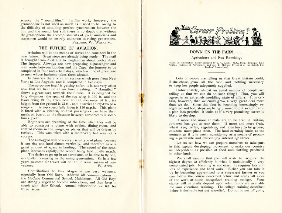 science, the " sound film." In film work, however, the gramophone is not used as much as it used to be, owing to the difficulty of obtaining perfect synchronism between the film and the sound, but still there is no doubt that without the gramophone the accomplishments of great musicians and statesmen would be entirely unknown to rising generations. FREDERIC W. WALKLING. THE FUTURE OF AVIATION.Aviation will be the means of travel and transport in the near future. Great steps are already being made. The mail is brought from Australia to England in about twelve days. The Imperial Airways are now proposing a passenger and mail route between London and the Cape, the journey to be completed in four and a half days, which will be of great use to men whose business takes them abroad. In America there is an air service which goes from New York to Los Angeles, and is completed in five days. The aeroplane itself is getting safer ; it is not very often now that we hear of an air liner crashing. " Hannibal " shows a great step towards the future. It is designed for long distances, the span of the top wing is 130 ft. and the lower wing 94 ft., from nose to tail measures 86 ft. ; its height from the ground is 25 ft., and it carries thirty-two passengers. Its top speed fully laden is 116 m.p.h. This plane is fitted with a kitchen, so that passengers can have their meals on board, as the distance between aerodromes is sometimes great. Engineers are dreaming of the time when they will be able to construct a plane with cabins, dining-room, and control rooms in the wings, or planes that will be driven by rockets. This was tried with a motor-car, but was not a success. The auto-gyro will be a very useful type of plane, because it can rise and land almost vertically, and therefore save a great amount of space in landing. The speed of the aeroplane increases rapidly, the record being held at 408 m.p.h. The desire to go up in an aeroplane, or be able to fly one, is rapidly increasing in the rising generation. So in a few years to come air travel will be the universal means of conveyance. W. APPS. Contributions to this Magazine are very welcome, especially from Old Boys. Address all communications to the McCabe Commercial School, Maidstone. All Old Boys are strongly urged to become subscribers, and thus keep in touch with their School. Annual subscription 2s. 6d. for three issues. |