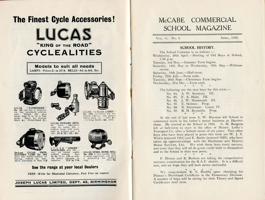 SCHOOL HISTORY.The School Calendar is as follows :- Wednesday, 20th April.-Meeting of Old Boys at School, 7.30 p.m. Tuesday, 3rd May.-Summer Term begins. Saturday, 14th May to Wednesday, 18th May.-Whitsun recess. Saturday, 18th June.-Half-term. Friday, 29th July.-Term ends. Tuesday, 20th Sept.-Christmas Term begins. Wednesday, 21st Dec.-Term ends. The following are the new boys for this term:- At the end of last term A. W. Harman left School to commence work in his father's motor business at Harrietsham. He started at the School in 1924. G. M. Burgess left at half-term to start in the office of Messrs. Loder's Transport Co. after a School career of six years. Two other boys who have been placed in posts this term are W. J. S. Welch (entered 1921) and E. Butler (entered 1929), who have taken up apprenticeships with the Maidstone and District Motor Services, Ltd. We wish these boys every success, and trust that they will all do great credit both to themselves and to the School in their new posts. P. Hinton and R. Bodiam are taking the competitive entrance examination for the R.A.F, shortly. It is a difficult test, and we hope they will both prove successful. We congratulate R. E. Bushby upon obtaining his Pitman's Shorthand Certificate in the Elementary Division. A number of boys will be sitting for their Theory and Speed Certificates next term. |