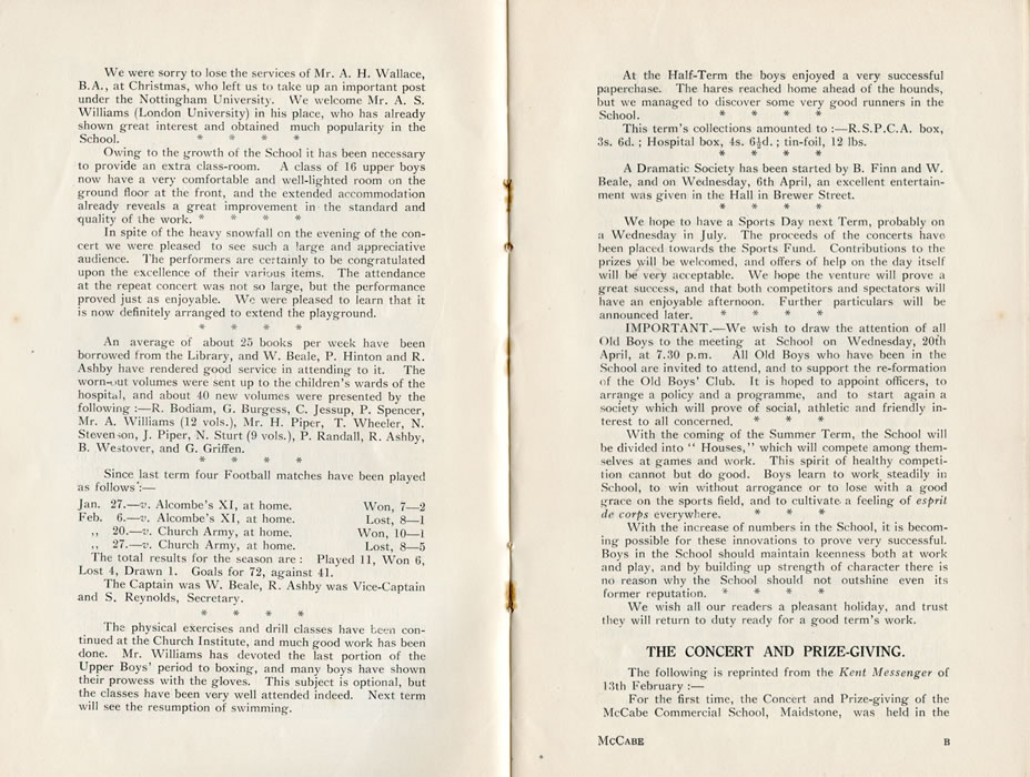 We were sorry to lose the services of Mr. A. H. Wallace, B.A., at Christmas, who left us to take up an important post under the Nottingham University. We welcome Mr. A. S. Williams (London University) in his place, who has already shown great interest and obtained much popularity in the School. Owing to the growth of the School it has been necessary to provide an extra class-room. A class of 16 upper boys now have a very comfortable and well-lighted room on the ground floor at the front, and the extended accommodation already reveals a great improvement in the standard and quality of the work. In spite of the heavy snowfall on the evening of the concert we were pleased to see such a large and appreciative audience. The performers are certainly to be congratulated upon the excellence of their various items. The attendance at the repeat concert was not so large, but the performance proved just as enjoyable. We were pleased to learn that it is now definitely arranged to extend the playground. An average of about 25 books per week have been borrowed from the Library, and W. Beale, P. Hinton and R. Ashby have rendered good service in attending to it. The worn-out volumes were sent up to the children's wards of the hospital, and about 40 new volumes were presented by the following :-R. Bodiam, G. Burgess, C. Jessup, P. Spencer, Mr. A. Williams (12 vols.), Mr. H. Piper, T. Wheeler, N. Stevenson, J. Piper, N. Sturt (9 vols.), P. Randall, R. Ashby, B. Westover, and G. Griffen. Since last term four Football matches have been played as follows:- Jan. 27.-v. Alcombe's XI, at home. Won, 7-2 Feb. 6.-v. Alcombe's XI, at home. Lost, 8-1 Feb 20.-v. Church Army, at home. Won, 10-1 Feb 27.-v. Church Army, at home. Lost, 8-5 The total results for the season are: Played 11, Won 6, Lost 4, Drawn 1. Goals for 72, against 41. The Captain was W. Beale, R. Ashby was Vice-Captain and S. Reynolds, Secretary. The physical exercises and drill classes have been continued at the Church Institute, and much good work has been done. Mr. Williams has devoted the last portion of the Upper Boys' period to boxing, and many boys have shown their prowess with the gloves. This subject is optional, but the classes have been very well attended indeed. Next term will see the resumption of swimming. At the Half-Term the boys enjoyed a very successful paperchase. The hares reached home ahead of the hounds, but we managed to discover some very good runners in the School. This term's collections amounted to:-R.S.P.C.A. box, 3s. 6d.; Hospital box, 4s. 6 ½ d. ; tin-foil, 12 lbs. A Dramatic Society has been started by B. Finn and W. Beale, and on Wednesday, 6th April, an excellent entertainment was given in the Hall in Brewer Street. We hope to have a Sports Day next Term, probably on a Wednesday in July. The proceeds of the concerts have been placed towards the Sports Fund. Contributions to the prizes will be welcomed, and offers of help on the day itself will be very acceptable. We hope the venture will prove a great success, and that both competitors and spectators will have an enjoyable afternoon. Further particulars will be announced later. IMPORTANT. We wish to draw the attention of all Old Boys to the meeting at School on Wednesday, 20th April, at 7.30 p.m. All Old Boys who have been in the School are invited to attend, and to support the re-formation of the Old Boys' Club. It is hoped to appoint officers, to arrange a policy and a programme, and to start again a society which will prove of social, athletic and friendly interest to all concerned. With the coming of the Summer Term, the School will be divided into "Houses", which will compete among them-selves at games and work. This spirit of healthy competition cannot but do good. Boys learn to work steadily in School, to win without arrogance or to lose with a good grace on the sports field, and to cultivate, a feeling of esprit de corps everywhere. With the increase of numbers in the School, it is becoming possible for these innovations to prove very successful. Boys in the School should maintain keenness both at work and play, and by building up strength of character there is no reason why the School should not outshine even its former reputation. We wish all our readers a pleasant holiday, and trust they will return to duty ready for a good term's work. THE CONCERT AND PRIZE-GIVING.The following is reprinted from the Kent Messenger of 13th February :- For the first time, the Concert and Prize-giving of the McCabe Commercial School, Maidstone, was held in the |