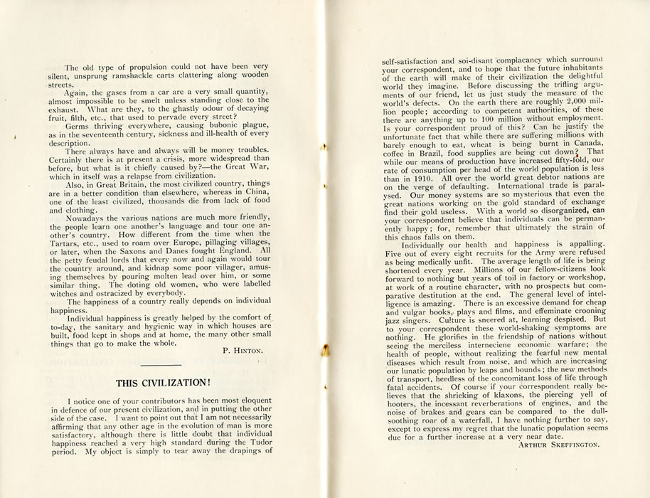 The old type of propulsion could not have been very silent, unsprung' ramshackle carts clattering along wooden streets. Again, the gases from a car are a very small quantity, almost impossible to be smelt unless standing close to the exhaust. What are they, to the ghastly odour of decaying fruit, filth, etc., that used to pervade every street? Germs thriving everywhere, causing bubonic plague, as in the seventeenth century, sickness and ill-health of every description. There always have and always will be money troubles. Certainly there is at present a crisis, more widespread than before, but what is it chiefly caused by?-the Great War, which in itself was a relapse from civilization. Also, in Great Britain, the most civilized country, things are in a better condition than elsewhere, whereas in China, one of the least civilized, thousands die from lack of food and clothing. Nowadays the various nations are much more friendly, the people learn one another's language and tour one another's country. How different from the time when the Tartars, etc., used to roam over Europe, pillaging villages, or later, when the Saxons and Danes fought England. All the petty feudal lords that every now and again would tour the country around, and kidnap some poor villager, amusing themselves by pouring molten lead over him, or some similar thing. The doting old women, who were labelled witches and ostracized by everybody. The happiness of a country really depends on individual happiness. Individual happiness is greatly helped by the comfort of to-day, the sanitary and hygienic way in which houses are built, food kept in shops and at home, the many other small things that go to make the whole. P. HIXTON. THIS CIVILIZATION!I notice one of your contributors has been most eloquent in defence of our present civilization, and in putting' the other side of the case. I want to point out that I am not necessarily affirming that any other age in the evolution of man is more satisfactory, although there is little doubt that individual happiness reached a very high standard during the Tudor period. My object is simply to tear away the drapings of self-satisfaction and soi-disant complacancy which surround your correspondent, and to hope that the future inhabitants of the earth will make of their civilization the delightful world they imagine. Before discussing the trifling arguments of our friend, let us just study the measure of the world's defects. On the earth there are roughly 2,000 million people; according to competent authorities, of these there are anything up to 100 million without employment. Is your correspondent proud of this? Can he justify the unfortunate fact that while there are suffering millions with barely enough to eat, wheat is being burnt in Canada, coffee in Brazil, food supplies are being cut down? That while our means of production have increased fifty-fold, our rate of consumption per head of the world population is less than in 1910. All over the world great debtor nations are on the verge of defaulting. International trade is paralysed. Our money systems are so mysterious that even the great nations working on the gold standard of exchange find their gold useless. With a world so disorganized, can your correspondent believe that individuals can be permanently happy ; for, remember that ultimately the strain of this chaos falls on them. Individually our health and happiness is appalling. Five out of every eight recruits for the Army were refused as being medically unfit. The average length of life is being shortened every year. Millions of our fellow-citizens look forward to nothing but years of toil in factory or workshop, at work of a routine character, with no prospects but comparative destitution at the end. The general level of intelligence is amazing. There is an excessive demand for cheap and vulgar books,, plays and films, and effeminate crooning jazz singers. Culture is sneered at, learning despised. But to your correspondent these world-shaking symptoms are nothing. He glorifies in the friendship of nations without seeing the merciless interneciene economic warfare; the health of people, without realizing the fearful new mental diseases which result from noise, and which are increasing our lunatic population by leaps and bounds ; the new methods of transport, heedless of the concomitant loss of life through fatal accidents. Of course if your correspondent really believes that the shrieking of klaxons, the piercing veil of hooters, the incessant reverberations of engines, and the noise of brakes and gears can be compared to the dull-soothing roar of a waterfall, I have nothing further to say, except to express my regret that the lunatic population seems due for a further increase at a very near date. ARTHUR SKEFFINGTON. |