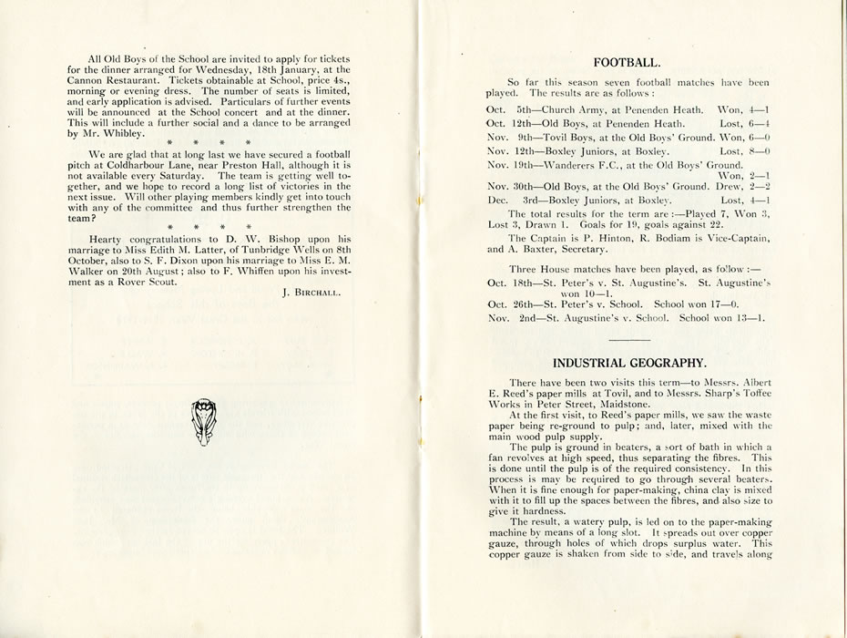 All Old Boys of the School are invited to apply for tickets for the dinner arranged for Wednesday, 18th January, at the Cannon Restaurant. Tickets obtainable at School, price 4s., morning or evening" dress. The number of seats is limited, and early application is advised. Particulars of further events will be announced at the School concert and at the dinner. This will include a further social and a dance to be arranged by Mr. Whibley. We are glad that at long last we have secured a football pitch at Coldharbour Lane, near Preston Hall, although it is not available every Saturday. The team is getting well together, and we hope to record a long list of victories in the next issue. Will other playing members kindly get into touch with any of the committee and thus further strengthen the team? Hearty congratulations to D. W. Bishop upon his marriage to Miss Edith M. Latter, of Tunbridge Wells on 8th October, also to S. F. Dixon upon his marriage to Miss E. M. Walker on 20th August; also to F. Whiffen upon his investment as a Rover Scout. J. BIRCHALL. FOOTBALL.So far this season seven football matches have been played. The results are as follows : Oct. 5th-Church Army, at Penenden Heath. Won, 4-1 Oct. 12th-Old Boys, at Penenden Heath. Lost, 6-4 Nov. 9th-Tovil Boys, at the Old Boys' Ground. Won, 6-0 Nov. 12th-Boxley Juniors, at Boxley. Lost, 8-0 Nov. 19th-Wanderers F.C., at the Old Boys' Ground. Won, 2-1 Nov. 50th-Old Boys, at the Old Boys' Ground. Drew, 2-2 Dec. 3rd-Boxlev Juniors, at Boxlev. Lost, 4-1 The total results for the term are :-Played 7, Won 3, Lost 3, Drawn 1. Goals for 19, goals against 22. The Captain is P. Hinton, R. Bodiam is Vice-Captain, and A. Baxter, Secretary. Three House matches have been played, as follow : - Oct. 18th-St. Peter's v. St. Augustine's. St. Augustine's won 10-1. Oct. 26th-St. Peter's v. School. School won 17-0. Nov. 2nd-St. Augustine's v. School. School won 13-1. INDUSTRIAL GEOGRAPHY.There have been two visits this term-to Messrs. Albert E. Reed's paper mills at Tovil, and to Messrs. Sharp's Toffee Works in Peter Street, Maidstone. At the first visit, to Reed's paper mills, we saw the waste paper being re-ground to pulp; and, later, mixed with the main wood pulp supply. The pulp is ground in beaters, a sort of bath in which a fan revolves at high speed, thus separating the fibres. This is done until the pulp is of the required consistency. In this process is may be required to go through several beaters. When it is fine enough for paper-making, china clay is mixed with it to fill up the spaces between the fibres, and also size to give it hardness. The result, a watery pulp, is led on to the paper-making machine by means of a long slot. It spreads out over copper gauze, through holes of which drops surplus water. This copper gauze is shaken from side to side, and travels along |