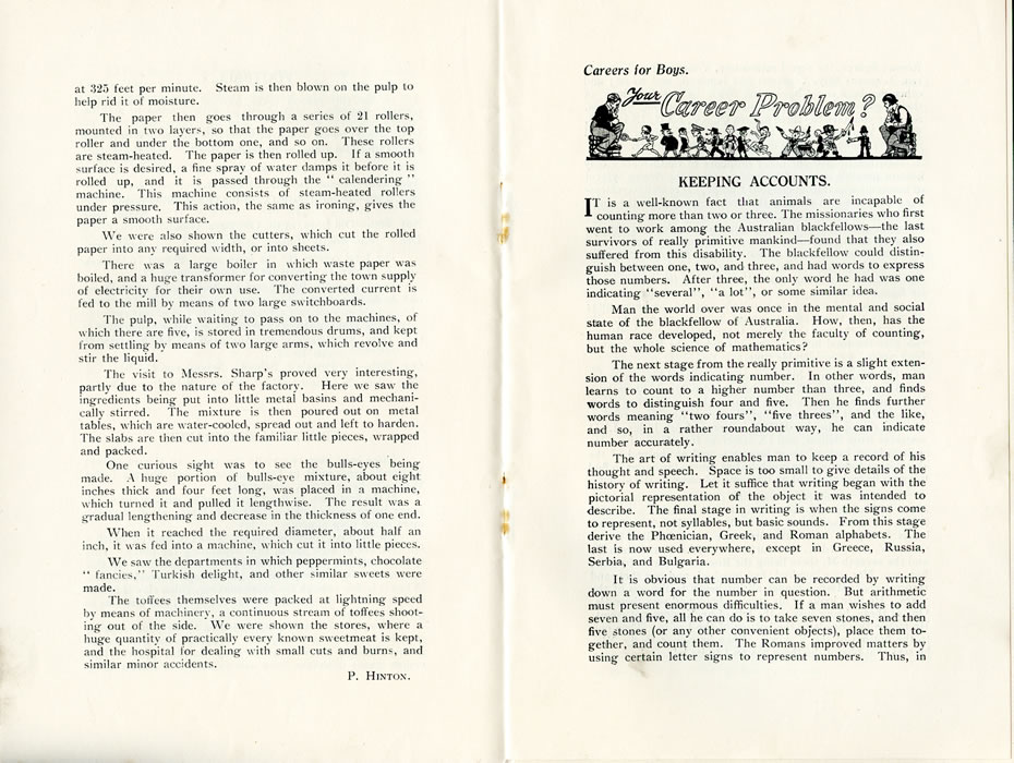 at 325 feet per minute. Steam is then blown on the pulp to help rid it of moisture. The paper then goes through a series of 21 rollers, mounted in two layers, so that the paper goes over the top roller and under the bottom one, and so on. These rollers are steam-heated. The paper is then rolled up. If a smooth surface is desired, a fine spray of water damps it before it is rolled up, and it is passed through the "calendering" machine. This machine consists of steam-heated rollers under pressure. This action, the same as ironing, gives the paper a smooth surface. We were also shown the cutters, which cut the rolled paper into any required width, or into sheets. There was a large boiler in which waste paper was boiled, and a huge transformer for converting the town supply of electricity for their own use. The converted current is fed to the mill by means of two large switchboards. The pulp, while waiting to pass on to the machines, of which there are five, is stored in tremendous drums, and kept from settling by means of two large arms, which revolve and stir the liquid. The visit to Messrs. Sharp's proved very interesting, partly due to the nature of the factory. Here we saw the ingredients being put into little metal basins and mechanically stirred. The mixture is then poured out on metal tables, which are water-cooled, spread out and left to harden. The slabs are then cut into the familiar little pieces, wrapped and packed. One curious sight was to see the bulls-eyes being made. A huge portion of bulls-eye mixture, about eight inches thick and four feet long, was placed in a machine, which turned it and pulled it lengthwise. The result was a gradual lengthening and decrease in the thickness of one end. When it reached the required diameter, about half an inch, it was fed into a machine, which cut it into little pieces. We saw the departments in which peppermints, chocolate "fancies," Turkish delight, and other similar sweets were made. The toffees themselves were packed at lightning speed by means of machinery, a continuous stream of toffees shooting out of the side. We were shown the stores, where a huge quantity of practically every known sweetmeat is kept, and the hospital for dealing with small cuts and burns, and similar minor accidents. P. HINTON. |