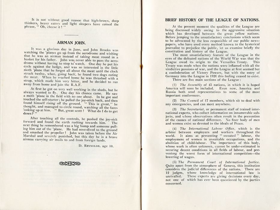 It is not without good reason that high-brows, deep thinkers, heavy eater- and light sleepers have coined the phrase, " Oh, cheese it !t" AIRMAN JOHN.It was a glorious day in June, and John Brooks was watching the 'planes go up from the aerodrome and wishing that he was an airman instead of taking meat round in a basket for his father. John was never able to pass the aerodrome without having to stop to watch. One day he put his cycle against the hedge, and was so interested in the little moth 'plane that he forgot all about the meat until the clock struck twelve, when, going back', he found two dogs eating the meat. When he reached home he was thrashed with a strap, which made him very bitter, and he decided to run away from home and join the R.A.F. At first he got on very well working in the sheds, but he always wanted to fly. One day his chance came. He saw a moth 'plane in the field with no one about. In he got and touched the self-starter ; he pulled the joy-stick back, and then found himself rising off the ground. " This is great," he thought, and managed to circle round, watching all the faces looking up at him. " But, great scott ! What do I do to get down?" After touching all the controls, he pushed the joy-sick forward and found the earth rushing towards him. The next thing he remembered was a big bump and someone pulling him out of the 'plane. He had nose-dived to the ground and smashed the propeller! John was taken before the Air Marshal and severely punished, but this day he is a brave airman carrying air mails to and from foreign lands. D. REYNOLDS, age 10. BRIEF HISTORY OF THE LEAGUE OF NATIONS.At the present moment the qualities of the League are-being discussed widely owing to the aggressive situation which has developed between the great yellow nations. Before jumping to the unsatisfactory conclusions which seem to be advocated by the less responsible of our public newspapers, who have used every method known to the hysterical journalist to prejudice the public, let us examine briefly the constitution and history of the League. The most unsatisfactory feature of the League in the eyes of the defeated nations of the World War was that the League owed its origin to the Versailles Treaty. This Treaty was made when the nations were inflamed with all the vindictive passions of war, and the League at first seemed but a confederation of Victory Powers, but with the entry of Germany into the League in 192G this feeling ceased to exist. There are five main sections of the League : (1) The Assembly of 45 nations, in which it is hoped America will soon be included. Even now, America and Russia both send representatives to some of the most important conferences. (2) The Council of 17 members, which sit to deal with any emergencies, and can meet anywhere. (3) The Secretariat, or permanent staff of trained international experts, who collect information on innumerable subjects, and whose observations often result in the prevention of the causes of national difference. Xo finer body of men and women exist so devoted to the ideals of Peace. (4) The International Labour Office, which is the arbiter between employers and workers throughout the world. It aims at preventing " sweated " labour, the employment of women in unsuitable occupations, and the abolition of child-labour. The importance of this body, whose work is often unknown, cannot be under-estimated in securing decent conditions in all fields of labour, and preventing the worst form of international competition-the lowering of wages. (5) The Permanent Court of International Justice. Quite apart from the atmosphere of Geneva, this institution considers the judicial differences of the nations. There are 12 judges, whose knowledge of international law is unrivalled. These experts are giving decisions every day, not one of which has ever been questioned by the parties concerned. |
