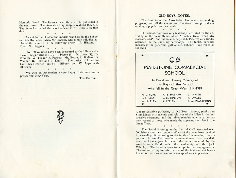 Memorial Fund. The figures for all these will be published in the next issue. The Armistice Day poppies realized 16s. 3½d. The School attended the short service at St. Peter's on that day. An exhibition of Meccano models was held in the School on 14th December, when Mr. Barker, who kindly adjudicated, placed the winners in the following order: P. Hinton, J. Piper, M. Higgins. Over 30 volumes have been presented to the Library this term: Edgar Butler (10), J. Pierce (8), D. Jones (4), D. Colinese, W. Tucker, S. Farman, Mr. Bettle, R. Bodiam, D. Winder, R. Relfe and E. Knott. The duties of Librarian have been carried out by J. Elbourn and W. Apps with efficiency. We wish all our readers a very happy Christmas and a prosperous New Year. THE EDITOR. Old Boys’ NotesThis last term the Association has made astounding progress, and all the events and functions have proved exceedingly popular and successful. The school-room was very tastefully decorated for the unveiling of the War Memorial on Armistice Day, when Mr. Bossom, M.P., and the Rev. Martyn (St. Peter's) very kindly attended for the unveiling ceremony. The tablet, in white marble, is the generous gift of Mr. Elbourn, and reads as follows :- CS MAIDSTONE COMMERCIAL SCHOOL In Proud and Loving Memory of the Boys of this School who fell in the Great War, 1914-1918 H. D. BURR L. F. ELEY W. R. ELEY A. E. HONOUR E. H. HINTON K. KEELEY C. WHITE A. WALLS R. A. WADKINSON A representative gathering of Old Boys, parents, pupils and Staff joined with friends and relatives of the fallen in the impressive ceremony, and the tablet remains now as a permanent record of those who made the supreme sacrifice in the Great War. The Social Evening at the Central Cafe attracted over 50 visitors and the strenuous efforts of the committee resulted in a small profit accruing to the funds after meeting the expenses. An excellent evening's entertainment was provided, not the least enjoyable being the items rendered by the Association's Band under the leadership of Mr. Jack Whibley. The band is open to accept further engagements. The committee appreciate the use of the fast car which was loaned on various occasions when speed was imperative. |