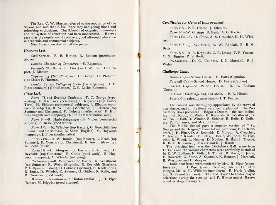 The Rev. C. W. Martyn referred to the reputation of the School, and said that in Mr. Piper they had young blood and refreshing enthusiasm. The School had extended in numbers and the system of education had been modernized. He was sure that the pupils would receive a good all-round education in academic and commercial subjects. Mrs. Piper then distributed the prizes. Honours List.Civil Service.- P. E. Hinton, R. Bodiam (particulars above). London Chamber of Commerce.- S. Reynolds. Pitman's Shorthand (3rd Class).- B. W. Finn, H. Philpott, J. Elbourn. Typewriting (2nd Class).- T. C. George, H. Philpott; (1st Class) F. Harman. London Trinity College of Music (1st steps).-J. H. E. Piper (honours); (Initial exam.) E. C. Locke (honours). Prize List.Form VI and Evening Students.-T. C. George (typewriting), F. Harman (typewriting), S. Reynolds (top Easter Term), H. Philpott (commercial subjects), J. Elbourn (commercial subjects), B. W. Finn (shorthand), P. Hinton (top Summer and Christmas), F. Tolputt (mathematics), P. Hinton (English and mapping), D. Potts (Matriculation work). Form V.-R. Harle (languages), F. Vidler (commercial subjects), S. Beale (good work). Form IVa.-K. Whibley (top Easter), G. Goodchild (top Summer and Christmas), E. Shaw (English), G. Haywood (mapping), J. Piper (mathematics). Form IVb.-R. W. Randall (top Easter), L. Beale (top Summer), F. Youens (top Christmas), E. Austin (drawing), E. Locke (music). Form III.- L. Morgan (top Easter and Summer), D. Reynolds (top Christmas), R. Corke (good work), E. Haywood (mapping), A. Wheeler (mapping). Preparatory.- B. Westover (top Easter), R. Westbrook (top Summer), R. Webb (English), B. Reynolds (English), P. Fulljames (history), D. Colinese (spelling), E. Knott (drill), D. Jones, D. Winder, E. Skinner, G. Griffen, R. Relfe, and R. Croucher (good work). Meccano Exhibition.- P. Hinton (senior), J. H. Piper (junior), M. Higgins (good attempt). Certificates for General Improvement.Form VI.- P. E. Hinton, J. Elbourn. Form V.- W. G. Apps, S. Beale, A. G. Baxter. Form IVa.- G. H. Stone, A. S. Croucher, K. H. Whibley. Form IVb.- J. W. Beale, R. W. Randall, F. E. M. Betts. Form III.- D. A. Reynolds, C. R. Jessup, F. P. Youens, M. G. Higgins, R. S. Brett. Preparatory.- D. C. Colinese, J. N. Marshall, R. J. Webb. Challenge Cups.House Cup.- School House. D. Potts (Captain). Football Cup.- School House. D. Potts (Captain). Cricket Cup.- St. Peter's House. R. A. Bodiam (Captain). Captain's Challenge Cup and Medal.- P. E. Hinton. Sports Cup (already awarded).- H. T. Pearce. The concert was thoroughly appreciated by the crowded attendance, and all the items were well applauded. The Preparatory Boys presented "Edgar's Dream," the cast including :-E. Knott, R. Webb, B. Reynolds, R. Westbrook, G. Griffen, B. Ball, D. Winder, E. Skinner, R. Relfe, D. Colinese, P. Fulljames, and Mrs. Stanford. The Middle School gave a popular version of "St. George and the Dragon," those taking part being E. C. Rowcroft, J. H. Piper, D. A. Reynolds, K. Morgan, A. Croucher, C. Jessup, P. Randall, F. Betts, J. Beale, W. Jones, M. Higgins, R. Wood, L. Noakes, D. 'Noakes, B. Ball, I. Thorpe, R. Brett, R. Corke, J. Barker and R. J. Randall. The principal item was the Dotheboys Hall scene from Dickens and the various characters were admirably sustained by R. W. Bodiam, F. Vidler, F. Tolputt, R. Harle, B. Joyce, E. Rowcroft, G. Stone, A. Seymour, K. Bonner, J. Marshall, B. Westover and L. Morgan. Individual items were rendered by Mrs. H. Piper (pianoforte solo), J. H. Piper (pianoforte solo), Mr. E. G. Bettle (songs), Mr. A. M. Williams (monologue), R. Harle (violin), and S. Reynolds (piano). The Old Boys' Orchestra played selections during the evening, and P. Hinton and A. Baxter acted as stage managers. |