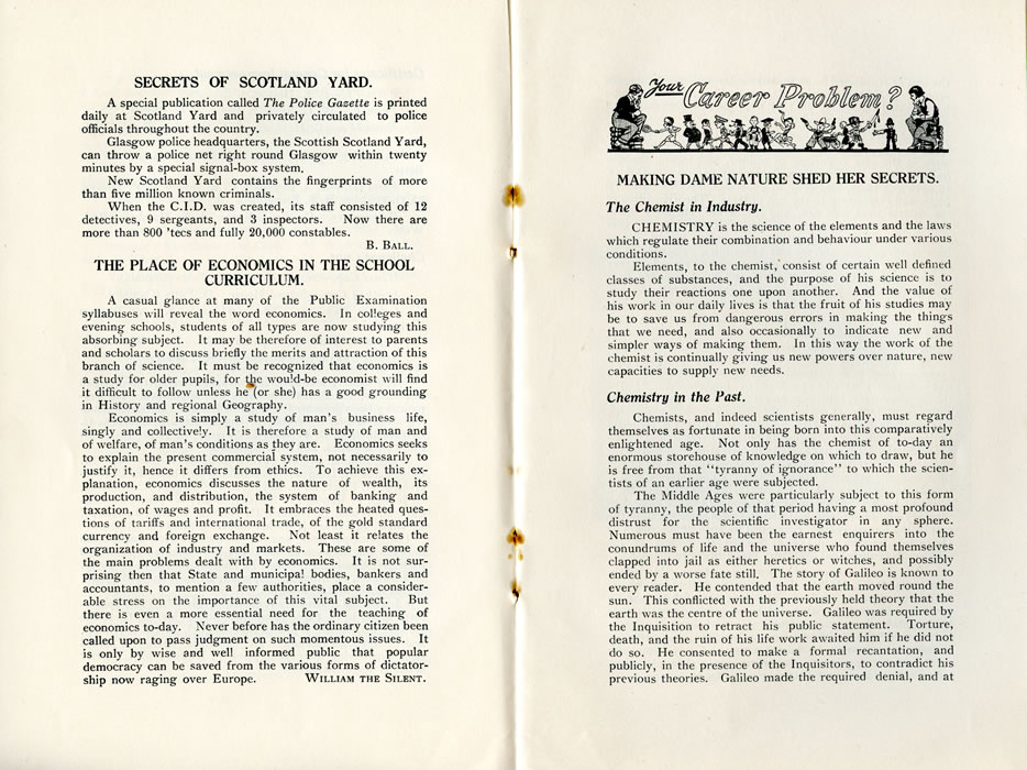 SECRETS OF SCOTLAND YARD.A special publication called The Police Gazette is printed daily at Scotland Yard and privately circulated to police officials throughout the country. B. BALL. THE PLACE OF ECONOMICS IN THE SCHOOL CURRICULUM.A casual glance at many of the Public Examination syllabuses will reveal the word economics. In colleges and evening schools, students of all types are now studying this absorbing subject. It may be therefore of interest to parents and scholars to discuss briefly the merits and attraction of this branch of science. It must be recognized that economics is a study for older pupils, for the would-be economist will find it difficult to follow unless he (or she) has a good grounding in History and regional Geography. Economics is simply a study of man's business life, singly and collectively. It is therefore a study of man and of welfare, of man's conditions as they are. Economics seeks to explain the present commercial system, not necessarily to justify it, hence it differs from ethics. To achieve this explanation, economics discusses the nature of wealth, its production, and distribution, the system of banking and taxation, of wages and profit. It embraces the heated questions of tariffs and international trade, of the gold standard currency and foreign exchange. Not least it relates the organization of industry and markets. These are some of the main problems dealt with by economics. It is not surprising then that State and municipal bodies, bankers and accountants, to mention a few authorities, place a considerable stress on the importance of this vital subject. But there is even a more essential need for the teaching of economics to-day. Never before has the ordinary citizen been called upon to pass judgment on such momentous issues. It is only by wise and well informed public that popular democracy can be saved from the various forms of dictatorship now raging over Europe. WILLIAM THE SILENT. |