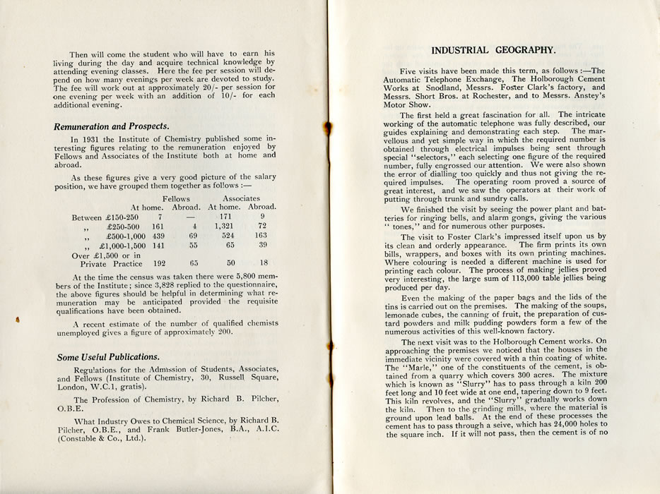 INDUSTRIAL GEOGRAPHY.Five visits have been made this term, as follows :-The Automatic Telephone Exchange, The Holborough Cement Works at Snodland, Messrs. Foster Clark's factory, and Messrs. Short Bros, at Rochester, and to Messrs. Anstey's Motor Show. The first held a great fascination for all. The intricate working of the automatic telephone was fully described, our guides explaining and demonstrating each step. The marvellous and yet simple way in which the required number is obtained through electrical impulses being sent through special "selectors," each selecting one figure of the required number, fully engrossed our attention. We were also shown the error of dialling too quickly and thus not giving the required impulses. The operating room proved a source of great interest, and we saw the operators at their work of putting through trunk and sundry calls. We finished the visit by seeing the power plant and batteries for ringing bells, and alarm gongs, giving the various " tones," and for numerous other purposes. The visit to Foster Clark's impressed itself upon us by its clean and orderly appearance. The firm prints its own bills, wrappers, and boxes with its own printing machines. Where colouring is needed a different machine is used for printing each colour. The process of making jellies proved very interesting, the large sum of 113,000 table jellies being produced per day. Even the making of the paper bags and the lids of the tins is carried out on the premises. The making of the soups, lemonade cubes, the canning of fruit, the preparation of custard powders and milk pudding powders form a few of the numerous activities of this well-known factory. The next visit was to the Holborough Cement works. On approaching the premises we noticed that the houses in the immediate vicinity were covered with a thin coating of white. The "Marie," one of the constituents of the cement, is obtained from, a quarry which covers 300 acres. The mixture which is known as "Slurry" has to pass through a kiln 200 feet long and 10 feet wide at one end, tapering down to 9 feet. This kiln revolves, and the "Slurry" gradually works down the kiln. Then to the grinding mills, where the material is ground upon lead balls. At the end of these processes the cement has to pass through a sieve, which has 24,000 holes to the square inch. If it will not pass, then the cement is of no |