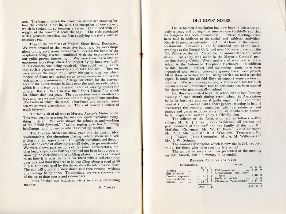 use. The bags in which the cement is stored are sewn up before the cement is put in, with the exception of one corner, which is tucked in, so forming a valve. Combined with the weight of the cement it seals the bag. The visit concluded with a pleasant surprise, the firm supplying the party with an excellent tea. Then to the premises of Messrs. Short Bros., Rochester. We were amazed at their extensive buildings, the workshops alone taking up a tremendous space. Seeing the floats of the seaplanes being riveted, combined with the explanations of our guide proved interesting. We were then taken into an enormous workshop where the largest flying boat ever built in this country was being repaired. One could hardly realize that such a gigantic monster could take the air. Then we were shown the large tank-over 100 yards long, on which models of floats are tested, so as to cut down air and water resistance to a minimum. A large structure for the conveyance of the experimenter is built over the tank on rails, along which it is driven by an electric motor at varying speeds for different floats. We also saw the "Short Mussel" in which Mr. Short died last year. The bus section was also interesting, and here we saw buses in different stages of construction. The tanks in which the metal is hardened and made to resist sea-water were also shown us. The visit proved a source of much interest. The last visit of all was to Messrs. Anstey's Motor Show. This was very interesting because our guide explained everything in detail. We were shown the principles and working of the " fluid flywheel," " self-changing gear box," dipping headlamps, and numerous other fascinating mechanisms. The Olympic Model on show gave one the idea of ideal workmanship, the chromium plating, which shone as silver, giving it a rich appearance. Our guide explained and demonstrated the error of allowing a small defect to go unattended. We were shown part sections of dynamos, carburettors, dipping headlamps, a car battery that had not been kept properly, showing the corroded and crumbling plates. It was explained to us how it is possible for a car fitted with a self-changing gear box and fluid flywheel to be travelling along a road at 50 m.p.h. to be changed by the driver directly into reverse gear. The car will gradually slow down and then reverse, without any damage being done. To conclude, we were shown some of the up-to-date sports and saloon cars. Thus finished our industrial visits in a very interesting manner. F. VIDLER. OLD BOYS' NOTES.The re-formed Association has now been in existence exactly a year, and during that time we can truthfully say that its progress has been phenomenal. Twelve meetings have been held in addition to the social and athletic activities. Nearly 40 members attended the Annual Dinner at the Cannon Restaurant. Between 70 and 80 attended both of the social evenings at the Central Cafe, and over 100 were present at the Old Palace on the 30th March for the annual dance and whist drive. An entry was made in the Mayor's Carnival procession during Cricket Week and a visit was paid with the school to the Automatic Telephone Exchange. In addition to this, football, cricket, and swimming teams have been organized and several enjoyable games have been played. All of these activities are still being carried on and a special appeal is made for all Old Boys to support some section or another. We are also organizing a Harriers' Club for such members as are interested, and an orchestra has been started for those who are musically inclined. Old Boys are invited to call at school on the last Tuesday evening of each month during term, when the Association holds its business and social gatherings. The committee meet at 7 p.m., and at 7.30 a short general meeting is held if necessary; the evening concludes with refreshments and games and gives an opportunity for all members to become better acquainted and to enjoy a friendly chat. The officers of the Association are as follows :-President : Mr. H. J. Piper. Vice-Presidents: all present and past members of the staff and the family of the late Mr. McCabe. Chairman : Mr. W. C. Beale. Vice-Chairmen : Mr. P. C. Allen and Mr. R. A. Woollard. Treasurer: Mr. K. J. Fowles. Joint Secretaries : Mr. A. M. Williams and Mr. J. W. Solman. The annual subscription which is now due is 2/6, reduced to 1/- for those who have recently left school. The annual balance sheet was presented at the meeting on 28th March, and a summary is appended. REVENUE ACCOUNT FOR YEAREXPENDITURE. INCOME. £ s. d. £ s. d. Printing 2 1 8 Old Association 3 16 0 Hire of room 1 0 0 Subscriptions and donations 4 10 0 Carnival expenses 1 16 0 Profit on socials 4 6 Loss on dinner 13 6 Balance 12 17 0 18 8 2 |