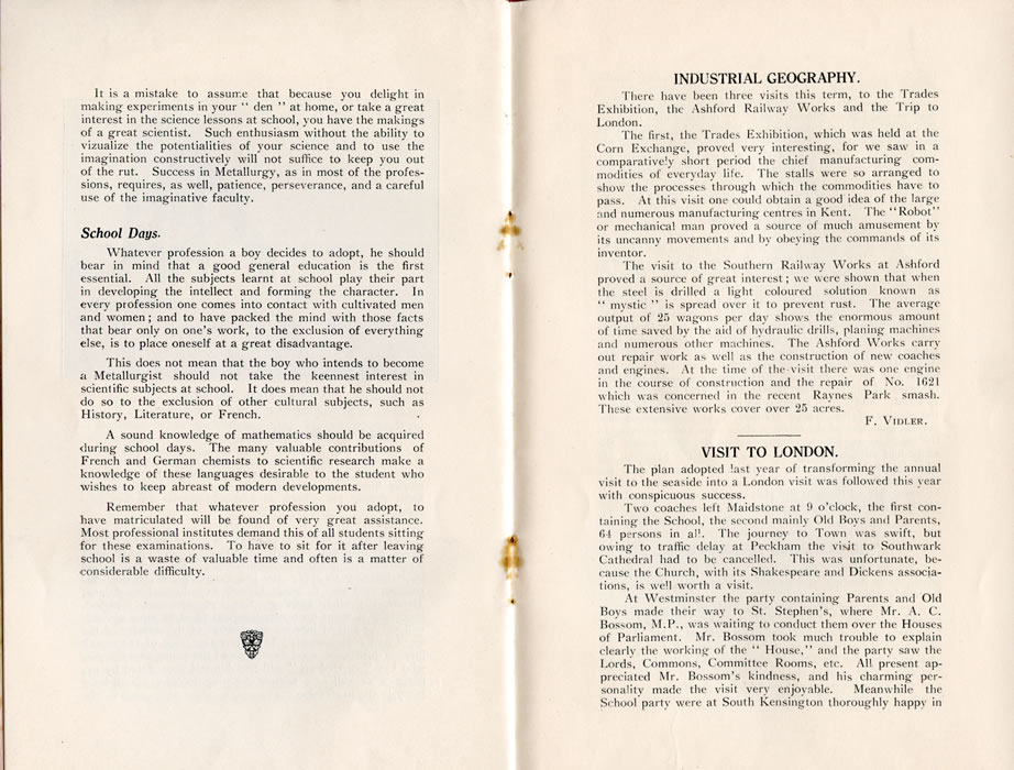 INDUSTRIAL GEOGRAPHY.There have been three visits this term, to the Trades Exhibition, the Ashford Railway Works and the Trip to London. The first, the Trades Exhibition, which was held at the Corn Exchange, proved very interesting, for we saw in a comparatively short period the chief manufacturing commodities of everyday life. The stalls were so arranged to show the processes through which the commodities have to pass. At this visit one could obtain a good idea of the large and numerous manufacturing centres in Kent. The "Robot" or mechanical man proved a source of much amusement by its uncanny movements and by obeying the commands of its inventor. The visit to the Southern Railway Works at Ashford proved a source of great interest; we were shown that when the steel is drilled a light coloured solution known as "mystic" is spread over it to prevent rust. The average output of 25 wagons per day shows the enormous amount of time saved by the aid of hydraulic drills, planing machines and numerous other machines. The Ashford Works carry out repair work as well as the construction of new coaches and engines. At the time of the visit there was one engine in the course of construction and the repair of Xo. 1621 which was concerned in the recent Raynes Park smash. These extensive works cover over 25 acres. F. VlDILER. VISIT TO LONDON.The plan adopted last year of transforming the annual visit to the seaside into a London visit was followed this year with conspicuous success. Two coaches left Maidstone at 9 o'clock, the first containing the School, the second mainly Old Boys and Parents, fit persons in all. The journey to Town was swift, but owing to traffic delay at Peckham the visit to Southwark Cathedral bad to be cancelled. This was unfortunate, because the Church, with its Shakespeare and Dickens associations, is well worth a visit. At Westminster the party containing Parents and Old Boys made their way to St. Stephen's, where Mr. A. C. Bossom, M.P., was waiting to conduct them over the Houses of Parliament. Mr. Bossom took much trouble to explain clearly the working of the " House," and the party saw the Lords, Commons, Committee Rooms, etc. All present appreciated Mr. Bossom's kindness, and his charming personality made the visit very enjoyable. Meanwhile the School party were at South Kensington thoroughly happy in |
