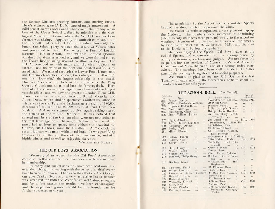 the Science Museum pressing buttons and turning knobs. Hero's steam-engine (AD 50) caused much amazement. A mild sensation was occasioned when one of the dreamy members of the Upper School walked by mistake into the Geological Museum next door, where the World Economic Conference was sitting. Apparently, the authorities mistook him for Litvinoff. After a brief look at London University and lunch, the School party rejoined the others at Westminster and proceeded to Tower Pier where the Port of London steamer "Isle of Arran," was waiting. Amidst glorious sunshine the steamer moved off, and we were thrilled to see the Tower Bridge swing upward to allow us to pass. The P.L.A. provided us with maps and the chief objects of interest, and the work of the port was pointed out to us by an official. We passed through the Lower Pool, Limehouse, and Greenwich reaches, noticing the sailing ship " Alastor," and the " Dominia," the largest cable-ship in the world. Our vessel entered the lock at the entrance of the King George V dock and so passed into the famous dock. Here we had a first-class and privileged view of some of the largest vessels afloat, and we saw the greatest London Flour Mill. From thence we were towed into the Royal Victoria and Albert Dock, where similar spectacles awaited us, amongst which was the s.s. Taranaki discharging a freight of 180,000 carcases of mutton, and 25,000 boxes of fruit from New-Zealand. And so we steamed up river again, taking tea to the strains of the " Blue Danube." It was noticed that several members of the German class were not neglecting to try that language on a charming fraulein. On arrival the party had an hour to spare, some visited the beautiful old Church, All Hallows, some the Guildhall. At 7 o'clock the return journey was made without mishap. It was gratifying to learn that all thought the visit very inexpensive, and of a highly educational as well as enjoyable character. WILLIAM THE SILENT. THE OLD BOYS' ASSOCIATION.We are glad to report that the Old Boys' Association continues to flourish, and there has been a welcome increase in membership. Its many and varied activities have been continued and extended, though, in keeping with the season, its chief events have been out of doors. Thanks to the efforts of Mr. George, our able Cricket Secretary, a very attractive list of fixtures was arranged for both the Wednesday and Saturday teams, and for a first season the results have been encouraging, and the experience gained should lay the foundations for further successes next year. The acquisition by the Association of a suitable Sports Ground has done much to popularize the Club. The Social Committee organized a very pleasant trip up the Medway. The numbers were somewhat disappointing (about twenty members were present) owing to the uncertain weather. Mention of the visit to the Houses of Parliament, by kind invitation of Mr. A. C. Bossom, M.P., and the visit to the Docks will be found elsewhere. Members enjoyed the Special Old Boys' races at the School Sports, and co-operated in the arrangements by acting as stewards, starters, and judges. We are fortunate in possessing the services of Messrs. Beale and Allen as Chairman and Vice-Chairman, and of a strong active committee. The meetings have been well attended, the latter part of the evenings being devoted to social purposes. We should be glad to see any Old Boy on the last Tuesday of each month; the Secretaries hope to enrol the hundredth member this year. THE SCHOOL ROLL. {Continued).Name Last Known Address Date of admission 201 Pearce, George "Woodman" Boxley Sept 1913 202 Gilbert, Frederick William 79 Week Street Sept 1913 203 Hopkins, Baden R Western Road Sept1913 204 Wood, Allen 7 St. George 's Square Sept 1913 205 Biixenstein, Claud Bridge House Hotel Sept 1913 206 Steer, William James 25 Canterbury Road, Pembury Sept 1913 207 Light, Alfred 286 Upper Fant Jan 1914 208 Toms, Hubert Reginald ''Delmonden" Holland Rd Jan 1914 209 Boardman, Arthur 92 Salisbury Road Jan 1913 210 Beale, Cyril ... 21 Brewer Street Jan 1913 211 Miller Edward St. Helen 's Corner, East Farleigh Jan 1913 212 Ballard, Frank 4 Orchard Villas, E. Malling Jan 1913 213 Burren, Abel "Burbridge," Eccles Feb 1914 214 Large, Harry Tonbridge Road (Deceased) Feb 1914 215 Hall, Harry Queen's Road Apr 1914 216 Maskell, Cecil Bower Street Apr 1914 217 Yeitch, Andrew Court Farm, Aylesford Apr 1914 218 Banfield, Philip George 9 Heath Grove, Barming Apr 1914 219 Barling, Louis “Whiteheath”, Hollingbourne Apr 1914 220 Thomson, Frank 97 Florence Road Apr 1914 221 White, Leonard Gatland Lane Apr 1914 222 Loosemore, Arthur Burnard 44 Oak Tree Avenue Sept 1914 223 Reynolds, Percy Bower Place Sept 1914 224 Beale, Clarence 21 Brewer Street Sept 1914 225 Williams, Donald 8 Stone Street Oct 1914 226 Grey, Noel Ashford Road Oct 1914 227 Large, Charles 219 Tonbridge Road Jan 1915 228 Burren, Gus "Sunnyside Cottage" Eccles Jan 1915 |