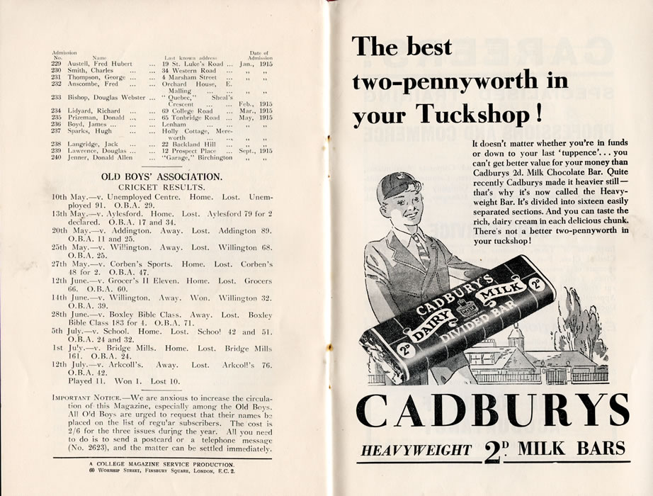 229 Austell, Fred Hubert 19 St. Luke's Road Jan 1915 230 Smith, Charles 34 Western Road Jan 1915 231 Thompson, George 4 Marsham Street Jan 1915 232 Anscombe, Fred Orchard House, E. Malling Jan 1915 233 Bishop, Douglas Webster “ Quebec" Sheal's Crescent Feb 1915 234 Lidyard, Richard 09 College Road Mar 1915 235 Prizeman, Donald 66 Tonbridge Road May 1915 236 Boyd, James Lenham May 1915 237 Sparks, Hugh Holly Cottage, Mereworth May 1915 238 Langridge, Jack 22 Backland Hill May 1915 239 Lawrence, Douglas 12 Prospect Place Sept 1915 240 Jenner, Donald Allen "Garage," Birchington Sept 1915 OLD BOYS' ASSOCIATION.CRICKET RESULTS.10th May.—v. Unemployed Centre. Home. Lost. Unemployed 91. O.R.A. 29. 13th May.—v. Aylesford. Home. Lost. Aylesford 79 for 2 declared. O.B.A. 17 and 34. 20th May.—v. Addington. Away. Lost. Addington 89. O.B.A. 11 and 25. 25th May.—v. Willington. Away. Lost. Willington (18. O.B.A. 25. 27th May.—v. Corben's Sports. Home. Lost. Corben's48 for 2. O.B.A. 47. 12th June.—v. Grocer's II Eleven. Home. Lost. Grocers 66. O.B.A. GO. 14th June.—v. Willington. Away. Won. Wellington 32. O.B.A. 39. 28th June.—v. Boxley Bible Class. Away. Lost. Boxley Bible Class 183 for 1. O.B.A. 71. 5th July.—v. School. Home. Lost. School 42 and 51.O.B.A. 24 and 32. 1st July.—v. Bridge Mills. Home. Lost. Bridge Mills 161. O.B.A. 24. 12th Julv.—v. Arkcoll's. Away. Lost. Arkcoll's 76. O.B.A. 42. Played 11. Won 1. Lost 10. |