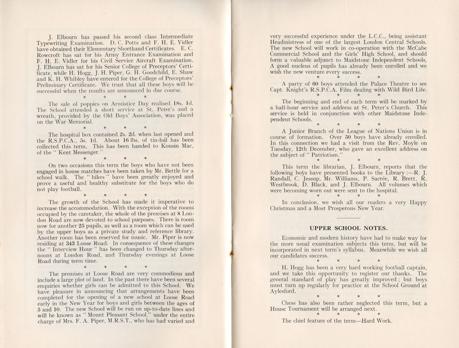 J. Elbourn has passed his second class Intermediate Typewriting Examination. D. C. Potts and F. H. E. Vidler have obtained their Elementary Shorthand Certificates. E. C. Rowcroft has sat for his Army Entrance Examination and F. H. E. Vidler for his Civil Service Aircraft Examination. J. Elbourn has sat for his Senior College of Preceptors' Certificate, while H. Hogg, J. H. Piper, G. H. Goodchild, E. Shaw and K. H. Whibley have entered for the College of Preceptors' Preliminary Certificate. We trust that all these boys will be successful when the results are announced in due course. The sale of poppies on Armistice Day realised 18s. 1d. The School attended a short service at St. Peter's and a wreath, provided by the Old Boys' Association, was placed on the War Memorial. The hospital box contained 2s. 2d. when last opened and the R.S.P.C.A., 5s. 1d. About 16 lbs. of tin-foil has been collected this term. This has been handed to Kousin Mac, of the " Kent Messenger." On two occasions this term the boys who have not been engaged in house matches have been taken by Mr. Bettle for a school walk. The "hikes" have been greatly enjoyed and prove a useful and healthy substitute for the boys who do not play football. The growth of the School has made it imperative to increase the accommodation. With the exception of the rooms occupied by the caretaker, the whole of the premises at 8 London Road are now devoted to school purposes. There is room now for another 25 pupils, as well as a room which can be used by the upper boys as a private study and reference library. Another room has been reserved for music. Mr. Piper is now residing at 343 Loose Road. In consequence of these changes the "Interview Hour" has been changed to Thursday afternoons at London Road, and Thursday evenings at Loose Road during term time. The premises at Loose Road are very commodious and include a large plot of land. In the past there have been several enquiries whether girls can be admitted to this School. We have pleasure in announcing that arrangements have been completed for the opening of a new school at Loose Road early in the New Year for boys and girls between the ages of 5 and 10. The new School will be run on up-to-date lines and will be known as "Mount Pleasant School," under the entire charge of Mrs. F. A. Piper, M.R.S.T., who has had varied and very successful experience under the L.C.C., being assistant Headmistress of one of the largest London Central Schools. The new School will work in co-operation with the McCabe Commercial School and the Girls' High School, and should form a valuable adjunct to Maidstone Independent Schools. A good nucleus of pupils has already been enrolled and we wish the new venture every success. A party of 60 boys attended the Palace Theatre to see Capt. Knight's R.S.P.C. A. Film dealing with Wild Bird Life. The beginning and end of each term will be marked by a half-hour service and address at St. Peter's Church. This service is held in conjunction with other Maidstone Independent Schools. A Junior Branch of the League of Nations Union is in course of formation. Over 50 boys have already enrolled. In this connection we had a visit from the Rev. Moyle on Tuesday, 12th December, who gave an excellent address on the subject of "Patriotism." This term the librarian, J. Elbourn, reports that the following boys have presented books to the Library :- R. J. Randall, C. Jessup, Mr. Williams, P. Sacr ée, R. Brett, R. Westbrook, D. Black, and J. Elbourn. All volumes which were becoming worn out were sent to the hospital. In conclusion, we wish all our readers a very Happy Christmas and a Most Prosperous New Year. UPPER SCHOOL NOTES.Economic and modern history have had to make way for the more usual examination subjects this term, but will be incorporated in next term's syllabus. Meanwhile we wish all our candidates success. II. Hogg has been a very hard working football captain, and we take this opportunity to register our thanks. The general standard of play has greatly improved; but boys must turn up regularly for practice at the School Ground at Aylesford. Chess has also been rather neglected this term, but a House Tournament will be arranged next. The chief feature of the term-Hard Work. |