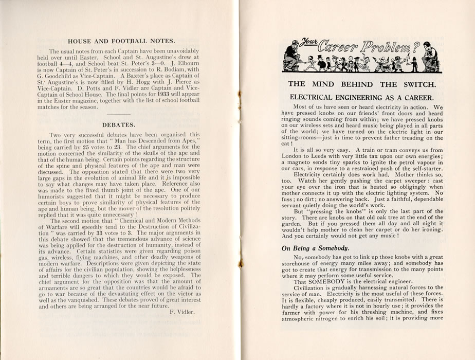 HOUSE AND FOOTBALL NOTES.The usual notes from each Captain have been unavoidably held over until Easter. School and St. Augustine's drew at football 4-4, and School beat St. Peter's 3-0. J. Elbourn is now Captain of St. Peter's in succession to R. Bodiam, with G. Goodchild as Vice-Captain. A Baxter's place as Captain of St.- Augustine's is now filled by H. Hogg with J. Pierce as Vice-Captain. D. Potts and F. Vidler are Captain and Vice-Captain of School House. The final points for 1933 will appear in the Easter magazine, together with the list of school football matches for the season. DEBATES.Two very successful debates have been organised this term, the first motion that " Man has Descended from Apes," being carried by 25 votes to 23. The chief arguments for the motion concerned the similarity of the skulls of the ape and that of the human being. Certain points regarding the structure of the spine and physical features of the ape and man were discussed. The opposition stated that there were two very large gaps in the evolution of animal life and it is impossible to say what changes may have taken place. Reference also was made to the fixed thumb joint of the ape. One of our humourists suggested that it might be necessary to produce certain boys to prove similarity of physical features of the ape and human being, but the mover of the resolution politely replied that it was quite unnecessary! The second motion that "Chemical and Modern Methods of Warfare will speedily tend to the Destruction of Civilization" was carried by 33 votes to 3. The major arguments in this debate showed that the tremendous advance of science was being applied for the destruction of humanity, instead of its advance. Certain statistics were given regarding poison gas, wireless, flying machines, and other deadly weapons of modern warfare. Descriptions were given depicting the state of affairs for the civilian population, showing the helplessness and terrible dangers to which they would be exposed. The chief argument for the opposition was that the amount of armaments are so great that the countries would be afraid to go to war because of the devastating effect on the victor as well as the vanquished. These debates proved of great interest and others are being arranged for the near future. F. Vidler. |