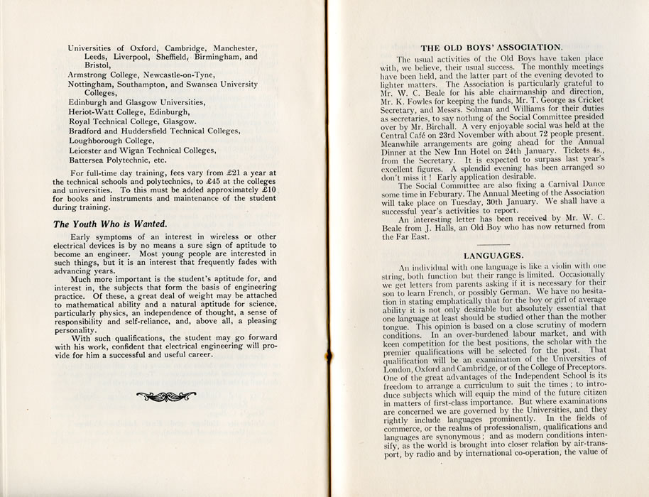THE OLD BOYS'ASSOCIATION.The usual activities of the Old Boys have taken place with, we believe, their usual success. The monthly meetings have been held, and the latter part of the evening devoted to lighter matters. The Association is particularly grateful to Mr. W. C. Beale for his able chairmanship and direction, Mr. K. Fowles for keeping the funds, Mr. T. George as Cricket Secretary, and Messrs. Solman and Williams for their duties as secretaries, to say nothing of the Social Committee presided over by Mr. Birchall. A very enjoyable social was held at the Central Cafe on 23rd November with about 72 people present. Meanwhile arrangements are going ahead for the Annual Dinner at the New Inn Hotel on 24th January. Tickets 4s., from the Secretary. It is expected to surpass last year's excellent figures. A splendid evening has been arranged so don't miss it! Early application desirable. The Social Committee arc also fixing a Carnival Dance some time in February. The Annual Meeting of the Association will take place on Tuesday, 30th January. We shall have a successful year's activities to report. An interesting letter has been received by Mr. W. C. Beale from J. Halls, an Old Boy who has now returned from the Far East. LANGUAGES.An individual with one language is like a violin with one string, both function but their range is limited. Occasionally we get letters from parents asking if it is necessary for their son to learn French, or possibly German. We have no hesitation in stating emphatically that for the boy or girl of average ability it is not only desirable but absolutely essential that one language at least should be studied other than the mother tongue. This opinion is based on a close scrutiny of modern conditions. In an over-burdened labour market, and with keen competition for the best positions, the scholar with the premier qualifications will be selected for the post. That qualification will be an examination of the Universities of London, Oxford and Cambridge, or of the College of Preceptors. One of the great advantages of the Independent School is its freedom to arrange a curriculum to suit the times; to introduce subjects which will equip the mind of the future citizen in matters of first-class importance. But where examinations are concerned we are governed by the Universities, and they rightly include languages prominently. In the fields of commerce, or the realms of professionalism, qualifications and languages are synonymous; and as modern conditions intensify, as the world is brought into closer relation by air-transport, by radio and by international co-operation, the value of |