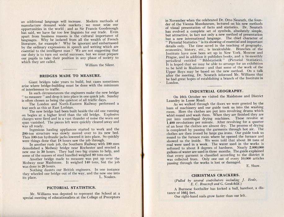 an additional language will increase. Modern methods of manufacture demand wide markets; we must seize our opportunities in the world ; and as Sir Francis Goodenough has said, we have far too few linguists for our trade. Even apart from business reasons is the cultural importance of languages. Why be isolated from all the wealth of French literature, for example ? Why be ignorant and embarrassed by the ordinary expressions in speech and writing which are essential to the intelligent man ? We are not suggesting that our duty is to turn out social successes, but we must prepare our pupils to take their position in any phase of society to which they are called. William the Silent. BRIDGES MADE TO MEASURE.Giant bridges take years to build, but cases sometimes arise where bridge-building must be done with the minimum of interference to traffic. In such circumstances the engineers make the new bridge " to measure " and drop it into place in one quick job. Sunday is often chosen as being the quietest of all traffic days. The London and North-Eastern Railway performed a feat such as this at East Lothian. The new bridge had been built beside the old one running on bogies at a higher level than the old bridge. Explosive charges were fired and in a vast thunder of noise the worn out span vanished. The pieces left were quickly cleared away and was all ready. Ingenious hauling appliances started to work and the 200-ton structure was slowly moved over to its new bed. Then 100-ton hydraulic jacks lowered it into place. So quickly were things done that 18 hours saw the job through. In another rush job, the Southern Railway with 100 men demolished a Medway bridge near Rochester and erected a new one in 30 hours. They had two big cranes to help, and some of the masses of steel handled weighed 80 tons each. Another bridge made to measure was put up over the Medway near Maidstone. It weighed 140 tons, but the job was done in 26 hours. Nothing daunts our British engineers. In one instance they wheeled one bridge out of the way, and the new one into its place. L. Noakes. PICTORIAL STATISTICS.Mr. Williams was deputed to represent the School at a special meeting of educationalists at the College of Preceptors in November when the celebrated Dr. Otto Neurath, the founder of the Vienna Mundaneum, lectured on his new methods of visual presentation of facts and statistics. Dr. Neurath has evolved a complete set of symbols, absolutely simple, but attractive, in fact not only a new method of presentation but a new international language. The chief character of " Pictorial Statistics " is its showing of essential and important details only. The time saved in the teaching of geography, economics, history, etc., is incalculable. Branches of the Institute have now been set up in New York, Moscow and Prague, and in addition it publishes books, and a bi-monthly periodical entitled "Bildstatistik" (Pictorial Statistics). It is hoped that we may be able to arrange for an exhibition to be held in Maidstone; and that some of the work of the Upper Boys may be based on the new method. On a talk after the meeting, Dr. Neurath informed Mr. Williams that he had great hopes of establishing a branch of the Institute in London. INDUSTRIAL GEOGRAPHY.On 16th October we visited the Maidstone and District Laundry in Loose Road. As we walked through the doors we were greeted by the hum of machinery and our guide took us into the washing room. Here the clothes are put into revolving drums which whirl round and wash them. When they are finished they are put into centrifugal drying machines. These revolve at 1,400 revolutions per minute. After revolving for a quarter of an hour the clothes are almost dry. The process of drying is completed by passing the garments through hot air. The clothes are then ironed by large gas irons. Our guide took us round to the furnace room where he opened the furnace and showed us the inside. We were told that about 10 tons of coal were used in a week. The water used in the works is softened to about 3 degrees of hardness. Nearly 2,000,000 gallons of water are used in three months. The guide explained that every garment is classified according to the district it was collected from. Only one out of every 10,000 articles passing through the works is lost or damaged. E. Shaw. CHRISTMAS CRACKERS.(Pulled by several contributors including J. Beale, E. C. Rowcroft and G. Goodchild.) A Burmese footballer has kicked a ball, barefoot, a distance of 166 ½ feet. Our right-hand nails grow faster than our left. |