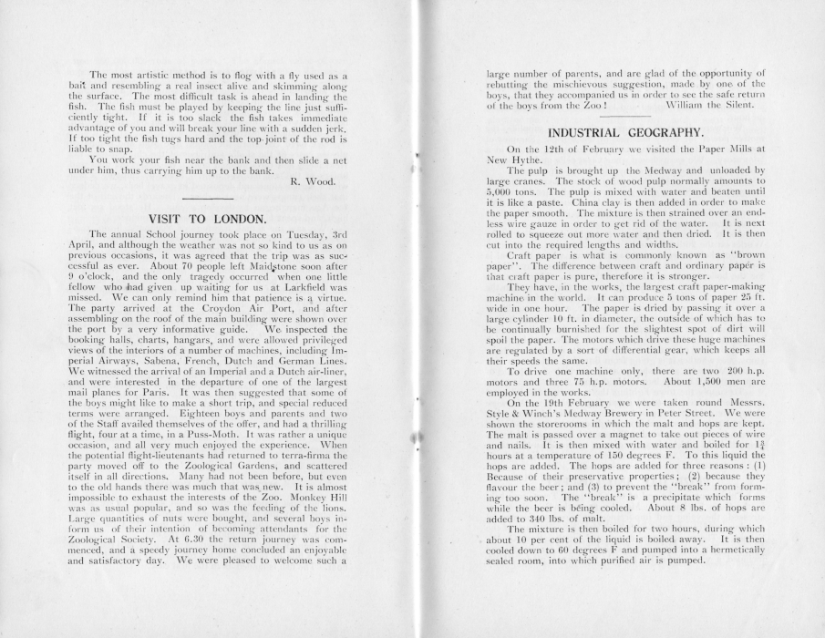 The most artistic method is to flog with a fly used as a bait and resembling a real insect alive and skimming along the surface. The most difficult task is ahead in landing the fish. The fish must be played by keeping the line just sufficiently tight. If it is too slack the fish takes immediate advantage of you and will break your line with a sudden jerk. If too tight the fish tugs hard and the top joint of the rod is liable to snap. You work your fish near the bank and then slide a net under him, thus carrying him up to the bank. R. Wood. VISIT TO LONDON.The annual School journey took place on Tuesday, 3rd April, and although the weather was not so kind to us as on previous occasions, it was agreed that the trip was as successful as ever. About 70 people left Maidstone soon after 9 o'clock, and the only tragedy occurred when one little fellow who had given up waiting for us at Larkfield was missed. We can only remind him that patience is a virtue. The party arrived, at the Croydon Air Port, and after assembling on the roof of the main building were shown over the port by a very informative guide. We inspected the booking halls, charts, hangars, and were allowed privileged views of the interiors of a number of machines, including Imperial Airways, Sabena, French, Dutch and German Lines. We witnessed the arrival of an Imperial and a Dutch air-liner, and were interested in the departure of one of the largest mail planes for Paris. It was then suggested that some of the boys might like to make a short trip, and special reduced terms were arranged. Eighteen boys and parents and two of the Staff availed themselves of the offer, and had a thrilling flight, four at a time, in a Puss-Moth. It was rather a unique occasion, and all very much enjoyed the experience. When the potential flight-lieutenants had returned to terra-firma the party moved off to the Zoological Gardens, and scattered itself in all directions. Many had not been before, but even to the old hands there was much that was new. It is almost impossible to exhaust the interests of the Zoo. Monkey Hill was as usual popular, and so was the feeding of the lions. Large quantities of nuts were bought, and several boys inform us of their intention of becoming attendants for the Zoological Society. At 6.30 the return journey was commenced, and a speedy journey home concluded an enjoyable and satisfactory day. We were pleased to welcome such a large number of parents, and are glad of the opportunity of rebutting the mischievous suggestion, made by one of the boys, that they accompanied us in order to see the safe return of the boys from the Zoo! William the Silent. INDUSTRIAL GEOGRAPHY.On the 12th of February we visited the Paper Mills at New Hythe. The pulp is brought up the Medway and unloaded by large cranes. The stock of wood pulp normally amounts to 5,000 tons. The pulp is mixed with water and beaten until it is like a paste. China clay is then added in order to make the paper smooth. The mixture is then strained over an endless wire gauze in order to get rid of the water. It is next rolled to squeeze out more water and then dried. It is then cut into the required lengths and widths. Craft paper is what is commonly known as "brown paper'. The difference between craft and ordinary paper is that craft paper is pure, therefore it is stronger. They have, in the works, the largest craft paper-making machine in the world. It can produce 5 tons of paper 25 ft. wide in one hour. The paper is dried by passing it over a large cylinder 10 ft. in diameter, the outside of which has to be continually burnished for the slightest spot of dirt will spoil the paper. The motors which drive these huge machines are regulated by a sort of differential gear, which keeps all their speeds the same. To drive one machine only, there are two 200 h.p. motors and three 75 h.p. motors. About 1,500 men are employed in the works. On the 19th February we were taken round Messrs. Style & Winch's Medway Brewery in Peter Street. We were Shown the storerooms in which the malt and hops are kept. The malt is passed over a magnet to take out pieces of wire and nails. It is then mixed with water and boiled for 13 hours at a temperature of 150 degrees F. To this liquid the hops are added. The hops are added for three reasons: (1) Because of their preservative properties; (2) because they flavour the beer; and (3) to prevent the "break" from forming too soon. The "break" is a precipitate which forms while the beer is being cooled. About 8 Ibs. of hops are added to 340 lbs. of malt. The mixture is then boiled for two hours, during which about 10 per cent of the liquid is boiled away. It is then cooled down to 60 degrees F and pumped into a hermetically sealed room, into which purified air is pumped. |