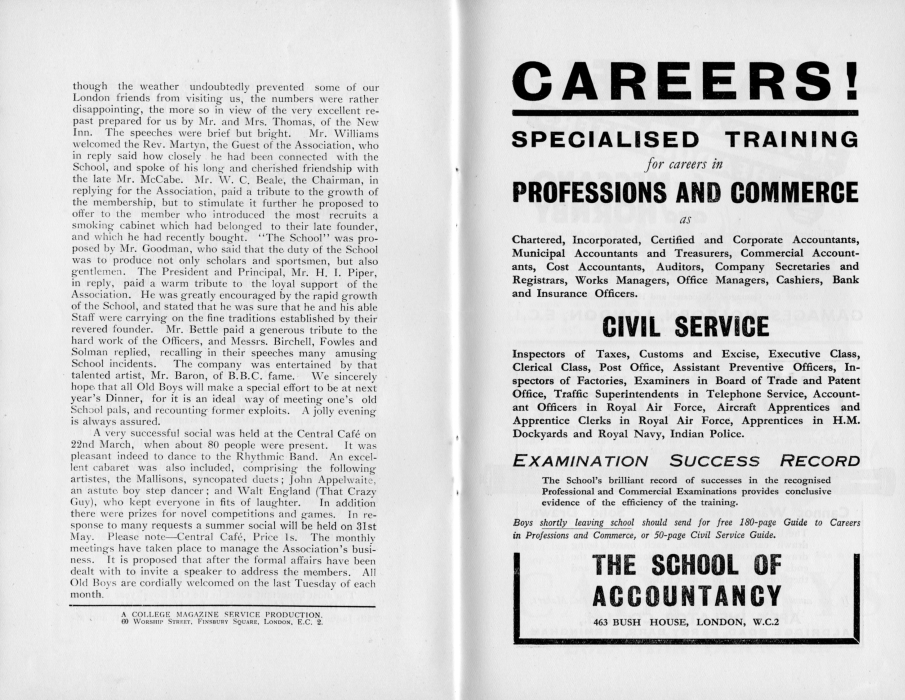 though the weather undoubtedly prevented some of our London friends from visiting us, the numbers were rather disappointing, the more so in view of the very excellent repast prepared for us by Mr. and Mrs. Thomas, of the New The speeches were brief but bright. Mr. Williams welcomed the Rev. Martyn, the Guest of the Association, who in reply said how closely. he had been connected with the School, and spoke of his long and cherished friendship with the late Mr. McCabe. Mr. W. C. Beale, the Chairman, in replying for the Association, paid a tribute to the growth of the membership, but to stimulate it further he proposed to offer to the member who introduced the most recruits a smoking cabinet which had belonged to their late founder, and which he had recently bought. "The School' was proposed by Mr. Goodman, who said that the duty of the School was to produce not only scholars and sportsmen, but also gentlemen. The President and Principal, Mr. H. I. Piper, in reply, paid a warm tribute to the loyal support of the Association. He was greatly encouraged by the rapid growth of the School, and stated that he was sure that he and his able Staff were carrying on the fine traditions established by their revered founder. Mr. Bettle paid a generous tribute to the hard work of the Officers, and Messrs. Birchell, Fowles and Solman replied, recalling in their speeches many amusing School incidents. The company was entertained by that talented artist, Mr. Baron, of B.B.C. fame. We sincerely hope that all Old Boys will make a special effort to be at next year's Dinner, for it is an ideal way of meeting one's old School pals, and recounting former exploits. A jolly evening is always assured. A very successful social was held at the Central Café on 22nd March, when about 80 people were present. It was pleasant indeed to dance to the Rhythmic Band. An excellent cabaret was also included, comprising the following artistes, the Mallisons, syncopated duets; John Appelwaite, an astute boy step dancer; and Walt England (That Crazy Guy), who kept everyone in fits of laughter. In addition there were prizes for novel competitions and games. In response to many requests a summer social will be held on 31st May. Please note Central Café, Price Is. The monthly meetings have taken place to manage the Association's busi-ness. It is proposed that after the formal affairs have been dealt with to invite a speaker to address the members. All Old Boys are cordially welcomed on the last Tuesday of each month. |