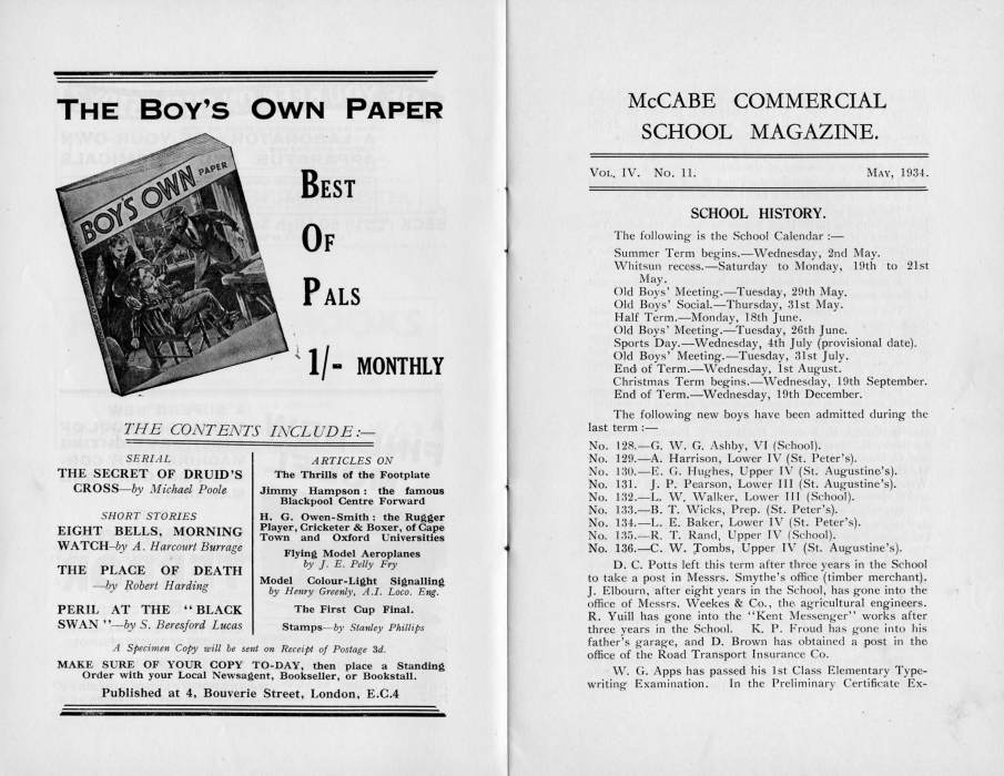D. C. Potts left this term after three years in the School to take a post in Messrs. Smythe's office (timber merchant). J. Elbourn, after eight years in the School, has gone into the office of Messrs. Weekes & Co., the agricultural engineers. R. Yuill has gone into the "Kent Messenger" works after three years in the School. K. P. Froud has gone into his father's garage, and D. Brown has obtained a post in the office of the Road Transport Insurance Co. W. G. Apps has passed his 1st Class Elementary Typewriting Examination. In the Preliminary Certificate Ex-
