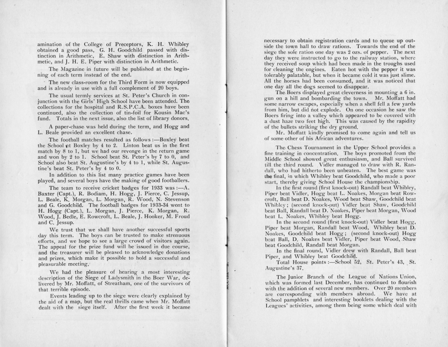 amination of the College of Preceptors, K. H. Whibley obtained a good pass, G. H. Goodchild passed with distinction in Arithmetic, E. Shaw with distinction in Arithmetic, and J. H. E. Piper with distinction in Arithmetic. The Magazine in future will be published at the beginning of each term instead of the end. The new class-room for the Third Form is now equipped and is already in use with a full complement of 20 boys. The usual termly services at St. Peter's Church in conjunction with the Girls' High School have been attended. The collections for the hospital and R.S.P.C.A. boxes have been continued, also the collection of tin-foil for Kousin Mac's fund. Totals in the next issue, also the list of library donors. A paper-chase was held during the term, and Hogg and L. Beale provided an excellent chase. The football matches resulted as follows: Boxley beat the School nt Boxley by 4 to 2. Linton beat us in the first match by 8 to 1, but we had our revenge in the return game and won by 2 to 1. School beat St. Peter's by 7 to 0, and School also beat St. Augustine's by 4 to 1, while St. Augustine's beat St. Peter's by 4 to 0. In addition to this list many practice games have been played, and several boys have the making of good footballers. The team to receive cricket badges for 1933 was: A. Baxter (Capt.), R. Bodiam, H. Hogg, J. Pierce, C. Jessup, L. Beale, K. Morgan, L. Morgan, R. Wood, N. Stevenson and G. Goodchild. The football badges for 1933-34 went to H. Hogg (Capt.), L. Morgan, J. Pierce, K. Morgan, R. Wood, J. Bedle, E. Rowcroft, L. Beale, J. Hooker, M. Froud and C. Jessup. We trust that we shall have another successful sports day this term. The boys can be trusted to make strenuous efforts, and we hope to see a large crowd of visitors again. The appeal for the prize fund will be issued in due course, and the treasurer will be pleased to acknowledge donations and prizes, which make it possible to hold a successful and pleasurable meeting. We had the pleasure of hearing a most interesting description of the Siege of Ladysmith in the Boer War, delivered by Mr. Moffatt, of Streatham, one of the survivors of that terrible episode. The Chess Tournament in the Upper School provides a fine training in concentration.